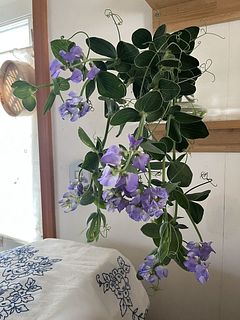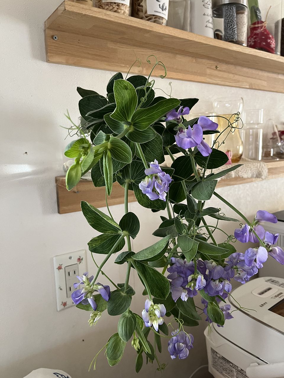 くるくると丸まったツルが豆の花らしいポイントに。動きを活かして飾るのがおすすめ。花もちが抜群で、1〜2週間ほどかけて先端のつぼみまで咲く姿を楽しめます。
