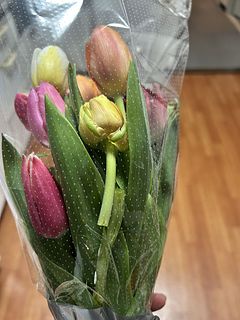 写真の通りカラフルでかわいいチューリップが届きました。 別売のカラフルスイートピーと一緒に飾ったら一気に春が来たようです。 ブーケ+ブーケの合わせ買いができるようになると嬉しいです。