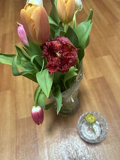 午前中に届いて、たっぷりの水で水揚げしてから、花瓶に活けました。八重咲、フリンジ咲など形も可愛く、色とりどりの10種類のチューリップ。どれもとても可愛くて元気です。特に、私は八重咲きのチューリップが好きなので、たくさん入っていてうれしいです。 丈短めですが、デスクに飾るのにちょうどよい長さです。 チューリップはこまめに水切りすると長くもつので、部屋が暖かくなりすぎないように気をつけながら長く楽しみたいと思います。