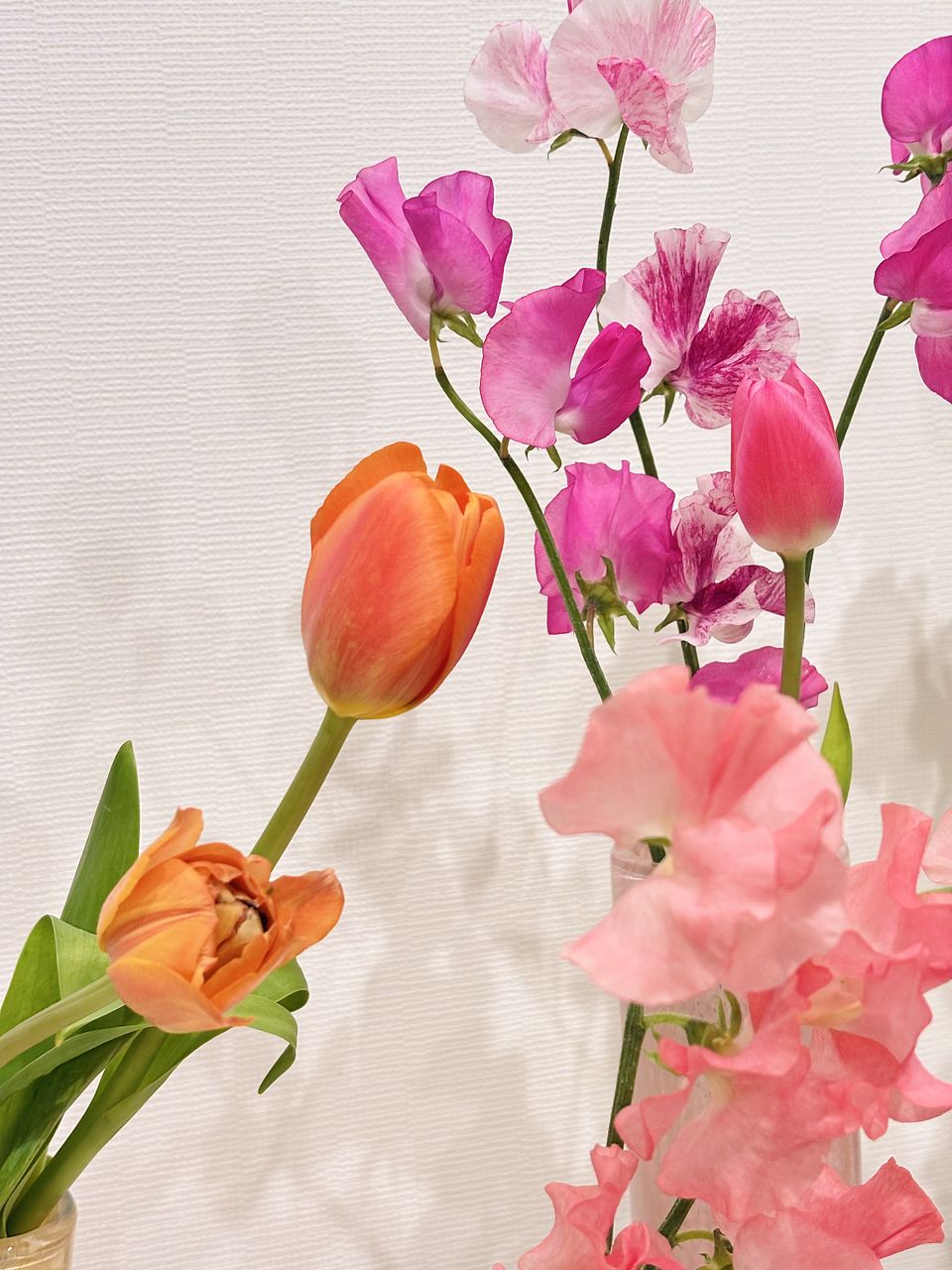 いつも同系色で花を飾りがちですが、この様々な色合いがとても可愛かったです。