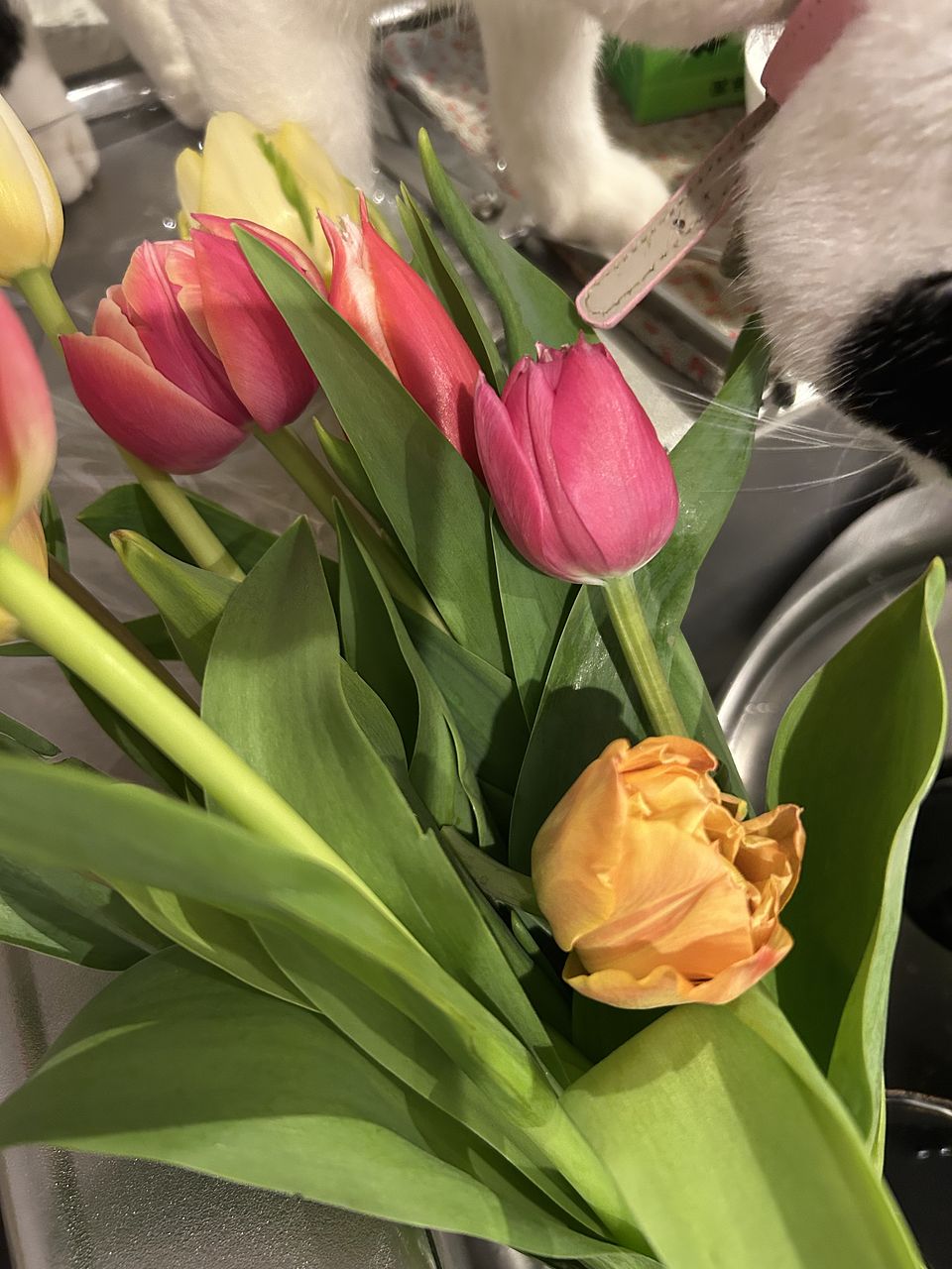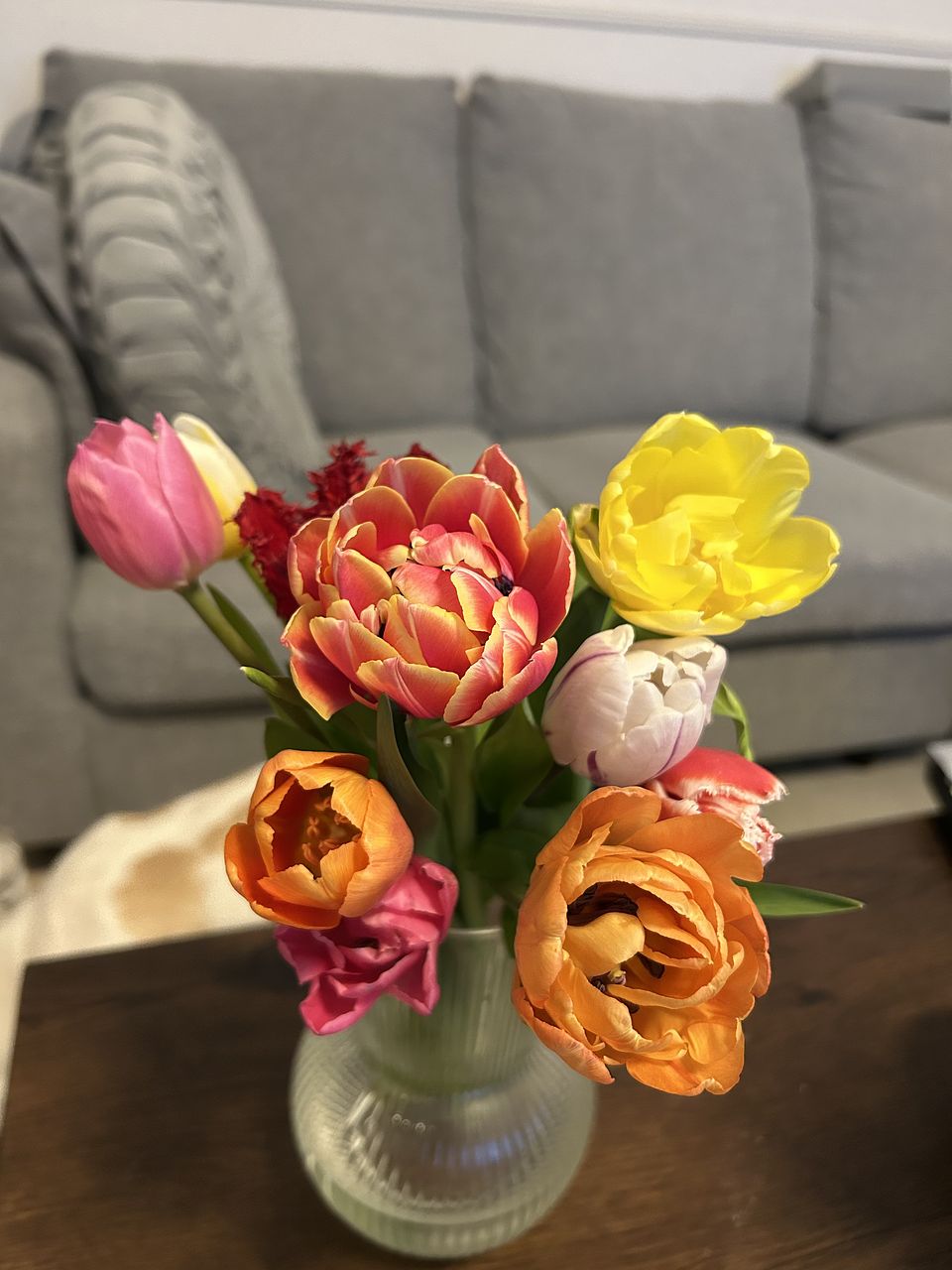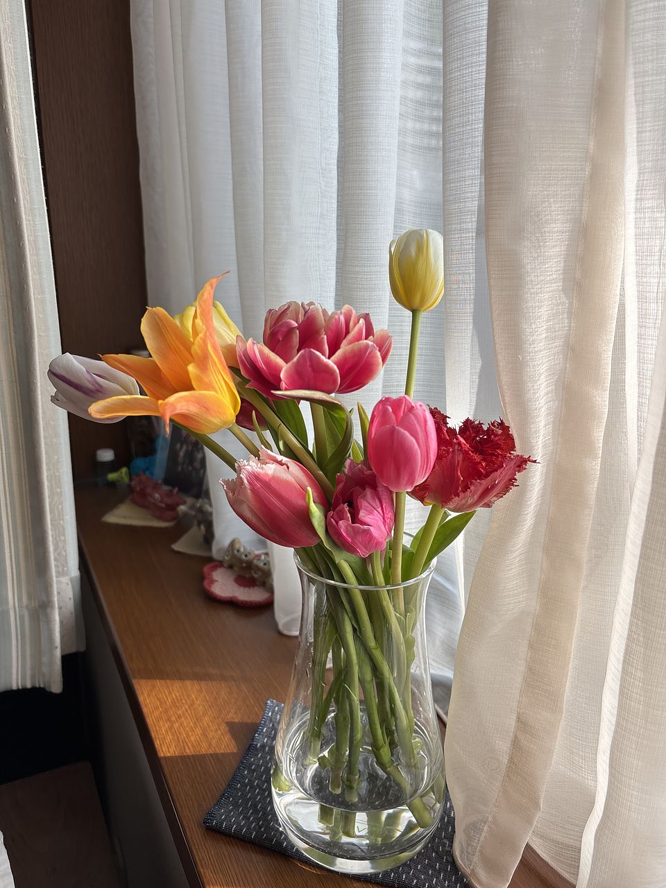 生き生きとした綺麗なチューリップが届きました🌷 カラフルで一気に部屋が華やかになりました。