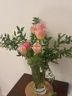 小さな白い花が手毬のように集まって咲く姿が可愛らしいコデマリと、春を代表するピンク色のチューリップ🌷