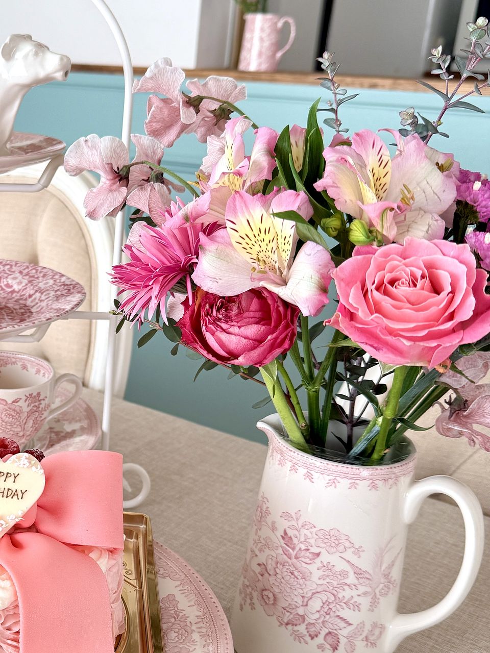思っていたよりも赤系のブーケだったので、近所のお花屋さんでたまたま見つけたピンクのスイトピーと合わせて飾りました。薔薇は早めに終わってしまったけど、ガーベラとカーネーションは10日近く経っても綺麗に咲いてます。