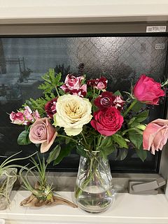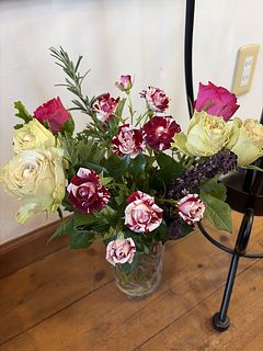 くすみカラーと落ち着いた赤系のバラでとても素敵な花束でした。ハーブも穏やかないい香りで見て香って癒されました。 お部屋が暖かいせいもありましたが、保ちはあまり良くないかもしれません。