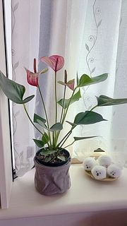 ハート形の葉と、ツヤツヤな質感の花が特徴のアンスリウム。