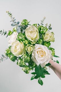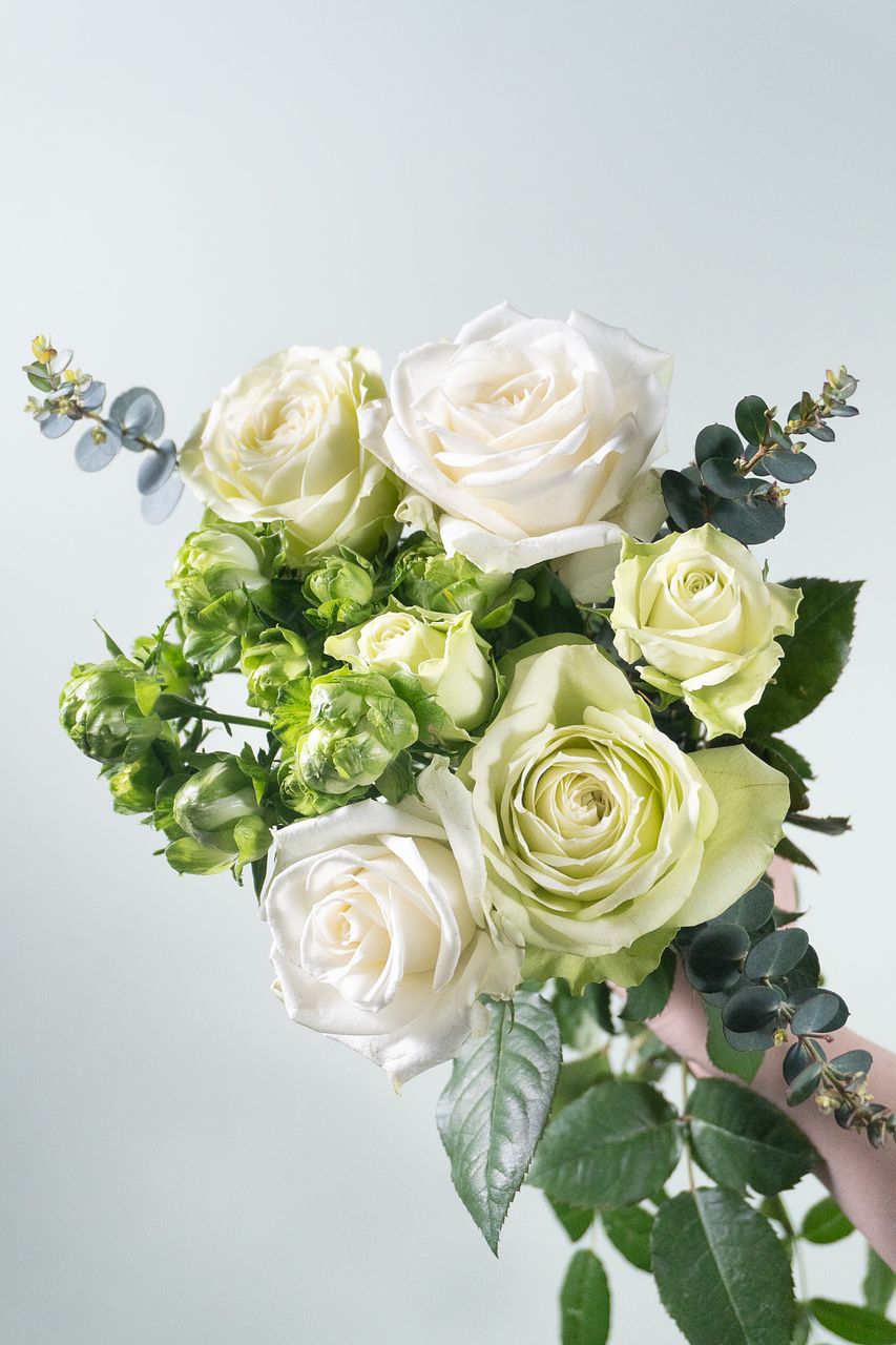 ホワイトとグリーンのバラを束ねた、ローズアソートブーケ。
