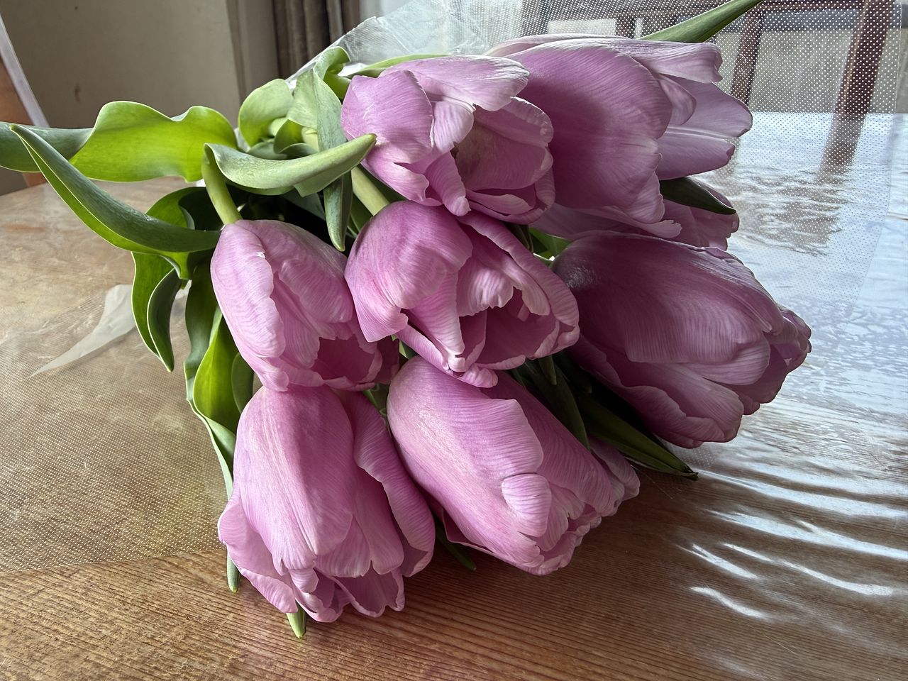 紫のチューリップが届きました!大好きな色だったので嬉しかったです。葉っぱにキズがあったりもしますが、それもまた良し。大事にしてながく楽しみます。