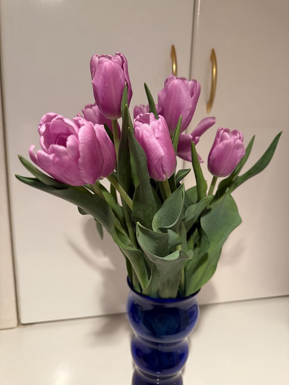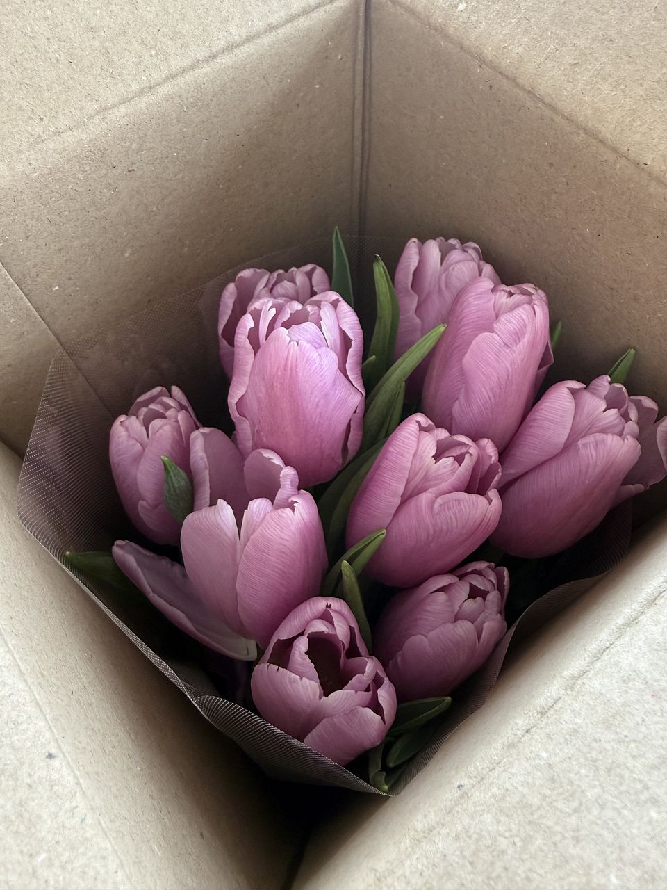 今朝お花届きました。きちんと箱に梱包されワクワクしながら開封しました。 チューリップのお花10本とても元気で すぐに下処理をし水揚げしてます。 少し紫🟣よりのカラーで茎も葉っぱもしっかりしてます。 次回はどんなお花にしようかと今から楽しみにしてます。 素敵なチューリップありがとうございました🌷