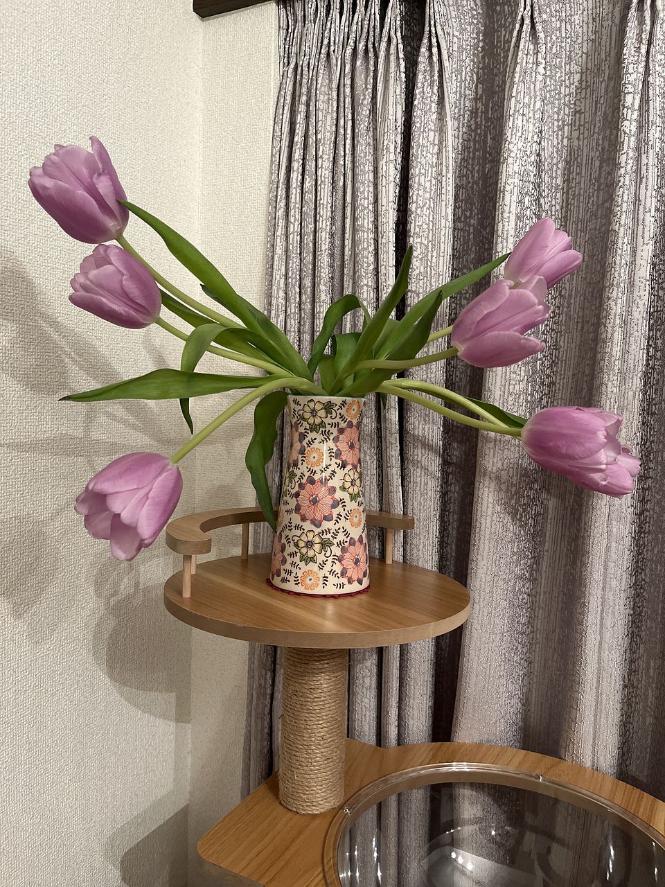綺麗なピンクパープル系のチューリップが届きました。 SNSで見つけたチューリップの葉を筒にし、ワイヤーで連結してその中に生けるように飾りました。残りは花瓶に。フレッシュで色も好みだったので良かったです。