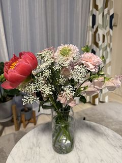 ボリュームがあり芍薬がふわっとしていて可愛いです3つの花瓶に分けて生けました。お花の香りがとても良く、長持ちさせてくれる薬も入っていてとても満足でした。