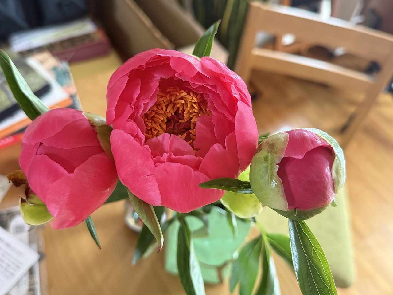 昨夜5本届いて、一つは咲きそうな感じで残りは蕾でしたが、数時間で咲きそうだったものは開花しました。そして、今日、蕾だったものも全て咲きました。花びらが少なめの芍薬の種類なので簡単に咲いたのかなと思いました。ただ、写真よりも花は小ぶりに感じました。色は素敵なサーモンピンクで、蕾から咲き初めの時は濃い色のピンクでした。