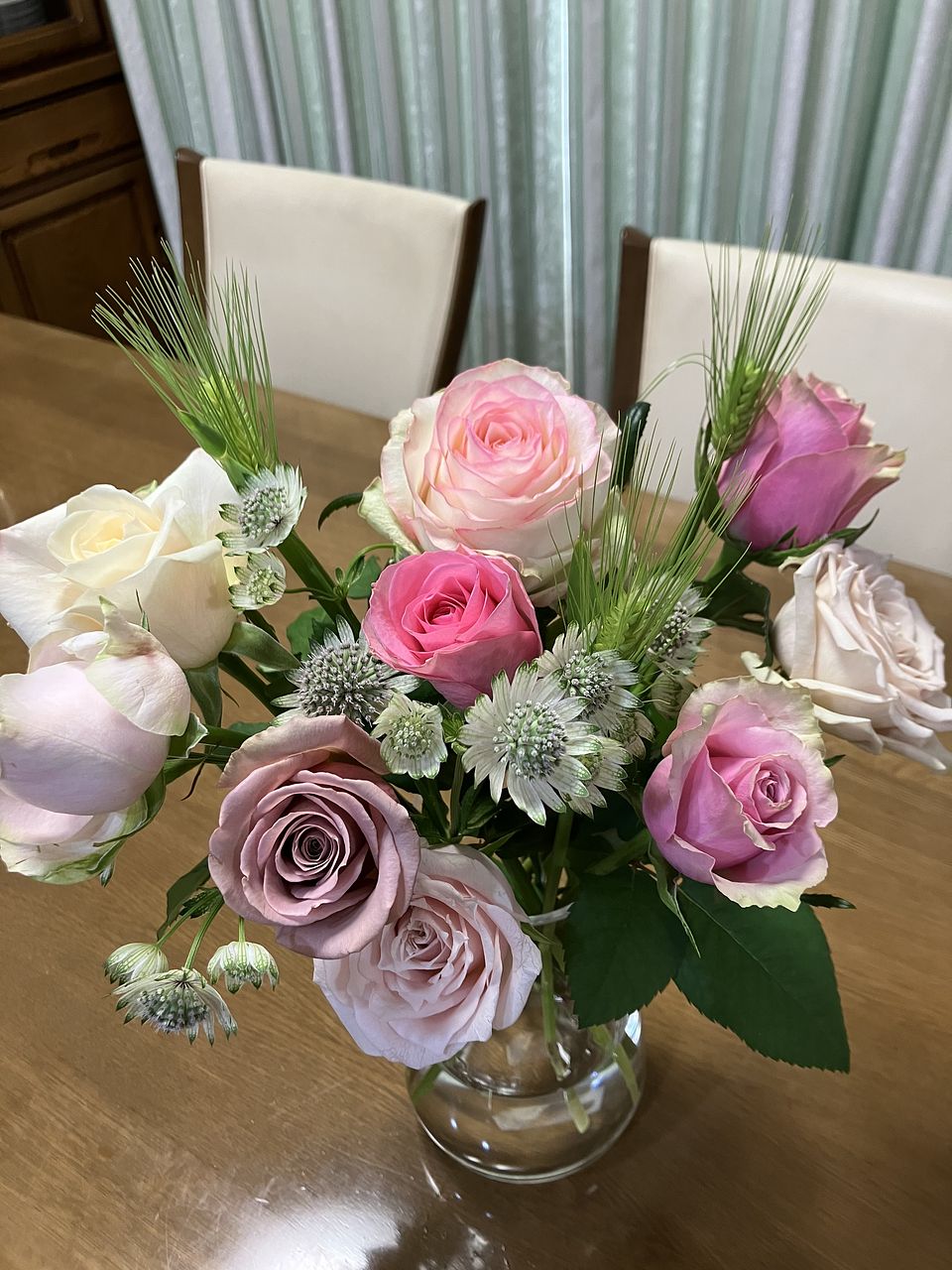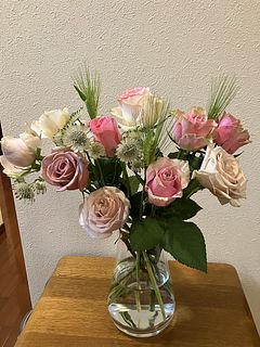 初めて利用しました。パステルピンクに可愛らしいバラたちが届きました。大きな白いバラはあまり持たなそうですが、他のバラたちはしばらく楽しめそうです。