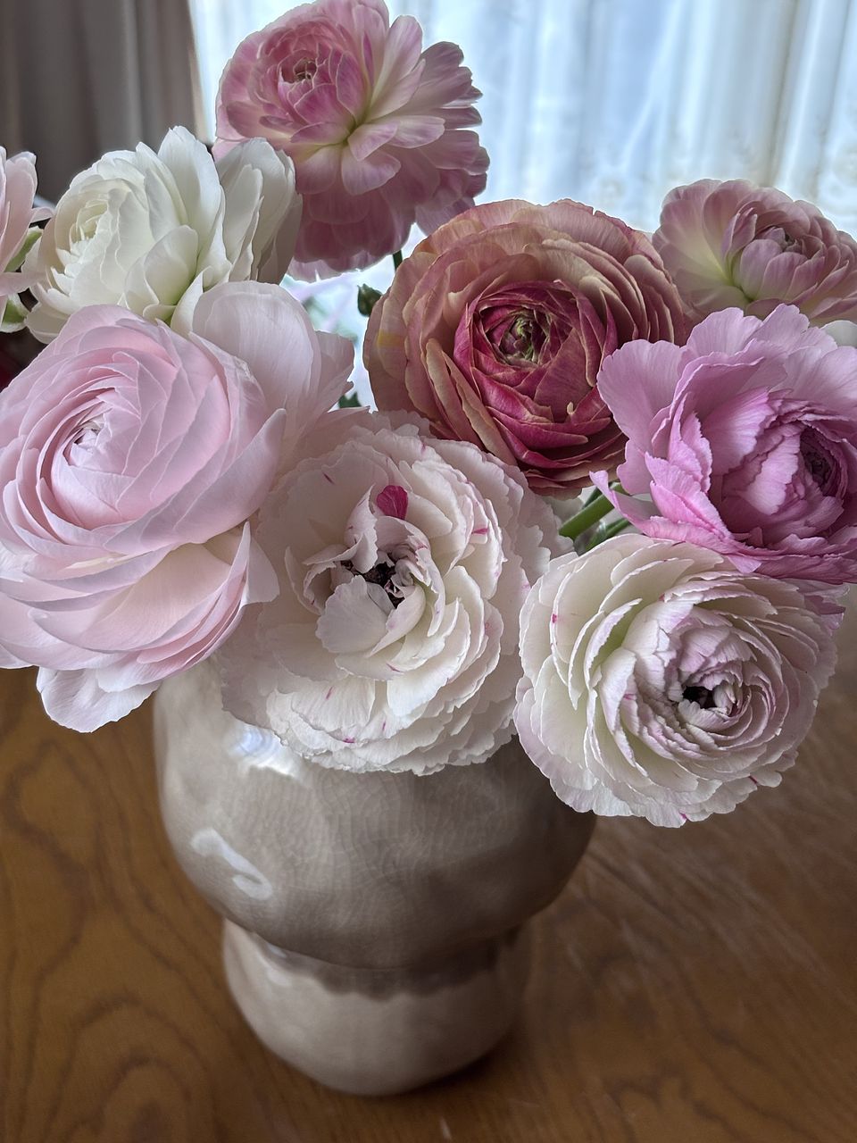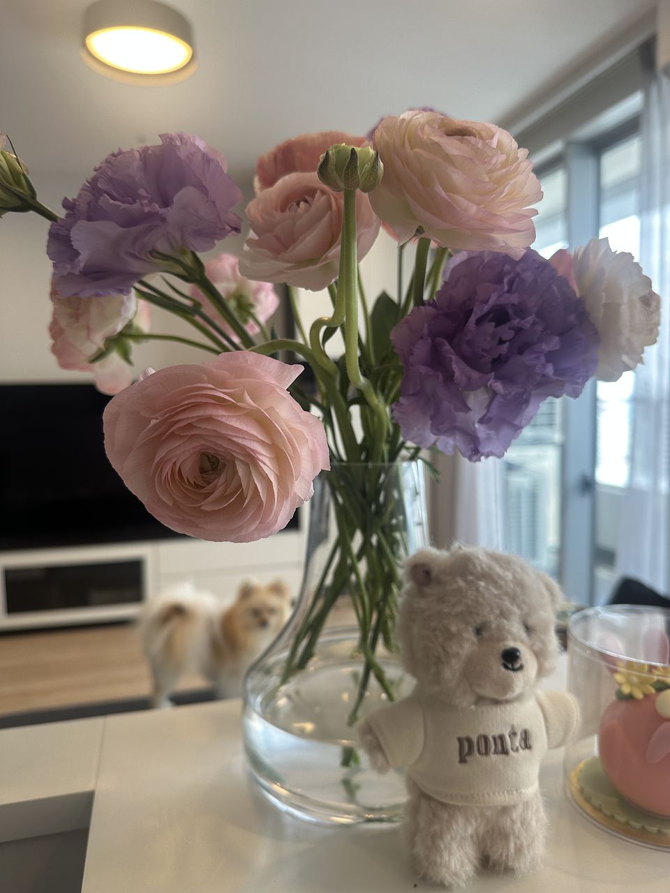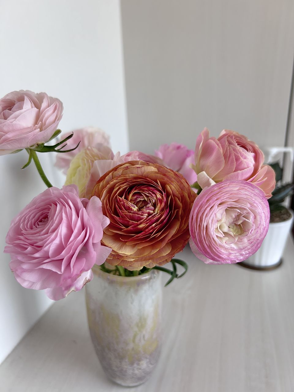 可愛いお色のラナンキュラス🩷 大好きなお花の1つです💕 前回購入の桜が満開で並べて飾っています🌸 長く楽しめるようにお手入れ頑張ります😊