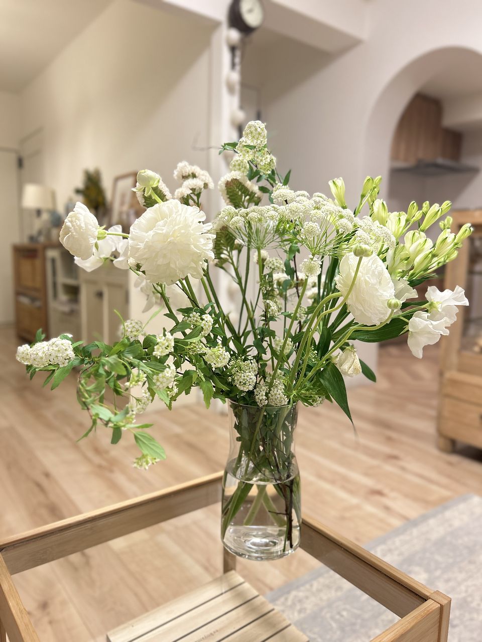 期待通りの白い清楚な花束が届きました!どの白いお花も素敵でした。コデマリのグリーンがボリューム感を出してくれています!スイトピーとコデマリの短い枝は別花瓶にしました。