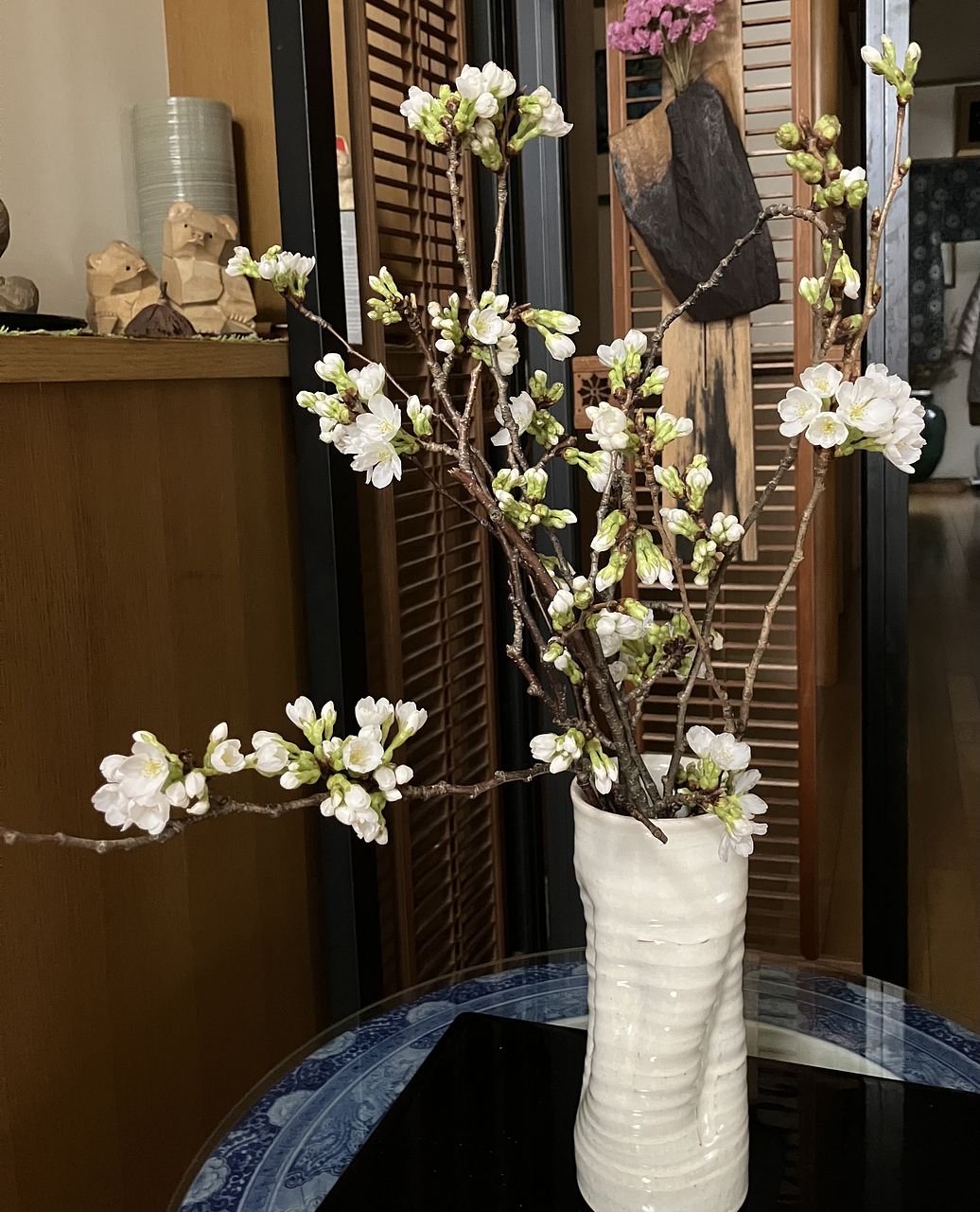 珍しい吉野桜、我が家の玄関に春が来ました。 蕾が見る見るうちに膨らんで咲いてきました🌸 枝物は持つので嬉しいです。