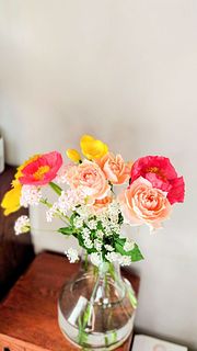 届いた時はバラがつぼみの状態だったのですが水揚げして花瓶に飾って一晩経ったら丁度いい状態に! 元々飾ってた花とあわせてめちゃくちゃかわいくなりました。 一本だけ赤いポピーが混ざってたのですがそれは別の花瓶に飾りました。