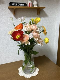 おまかせという事で、バラにガーベラ、カーネーションにポピー、レースフラワーなどボリュームがあって、明るい色合いに、元気をもらえました🥰 ありがとうございました!