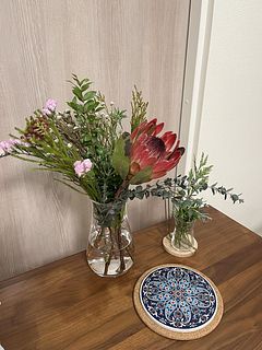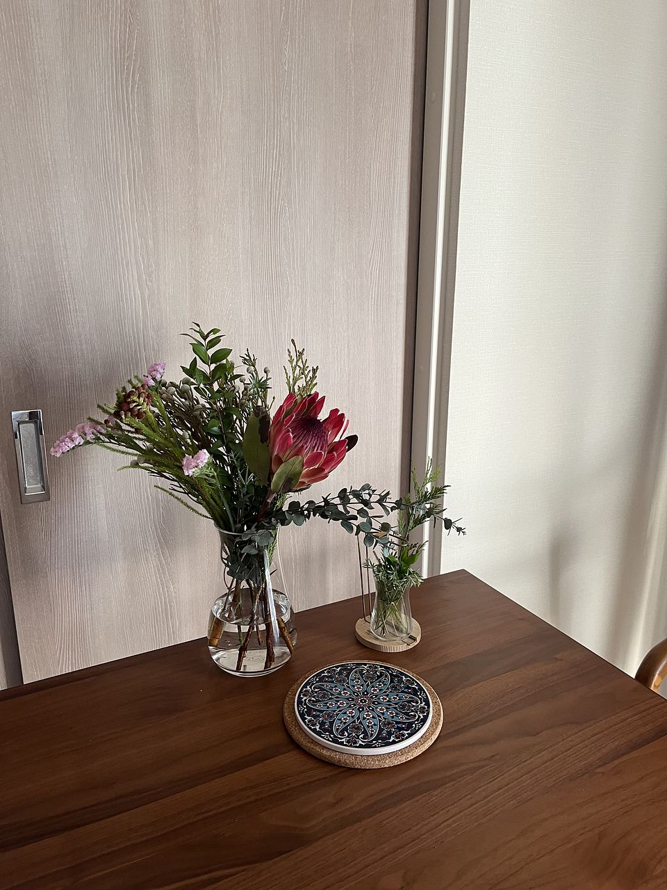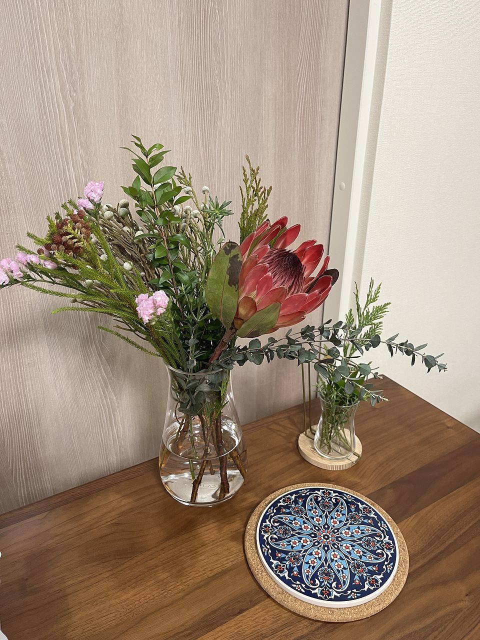 存在感たっぷりのプロテアを主役に、ローズマリーやユーカリをを束ねてみました🍓