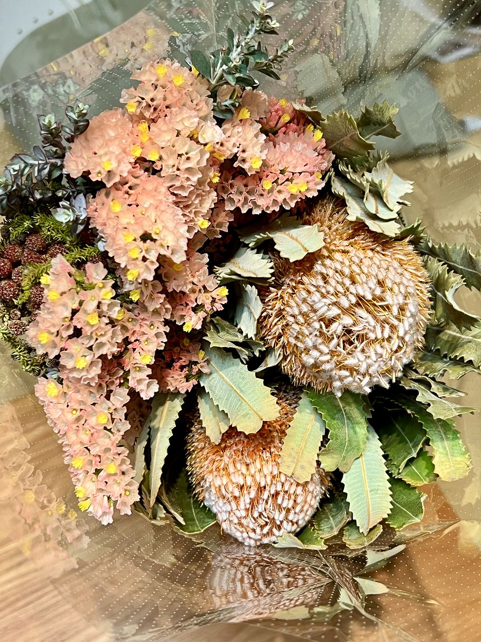 様々な形のネイティブフラワーやスターチスと合わせて、贅沢なスワッグブーケに🦁