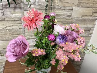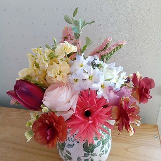 とてもかわいい花束が届きました!チューリップが一本花びらが落ちた状態で残念でしたが、10種類くらいの花が盛り沢山に入っていて、何より自分では選ばない組み合わせで楽しいです♡ありがとうございます!