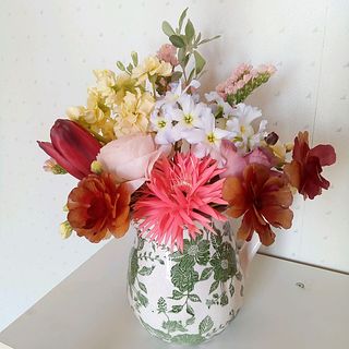 flowerさんで今まで購入した中では一番ボリュームがすごかったです!初めて花瓶2つに分けました。バラ、ラナンキュラス、ストック、チューリップ、カラーが届き、色も春色だったり、珍しい複色もあったりして、見るたび「可愛い!」が止まりません。