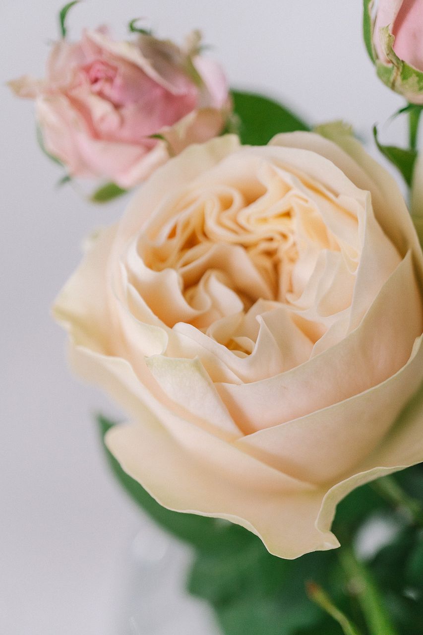 まず茎先をカットし、茎の7〜8割が浸かるイメージで深いお水に数時間つけてあげて。水圧で花に水が届きます。水揚げが完了したら、毎日のお世話は浅水〜中くらいの水量で。水換えはこまめにしてあげましょう。切花の栄養剤を使うと、バクテリアの増加を減らせるのでおすすめです。