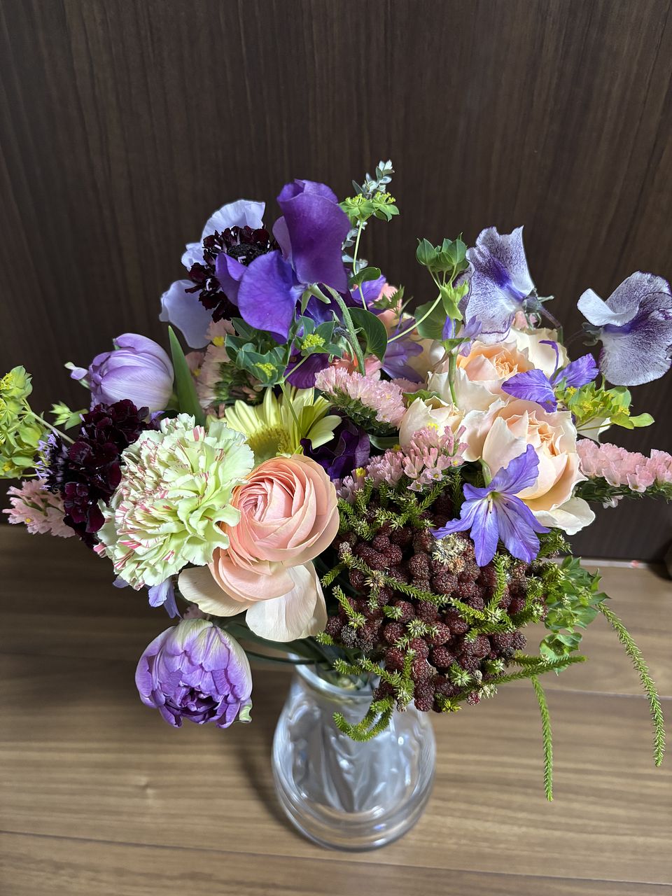 スパイラルに組まれていて葉の処理もしてあるのでそのまま飾って楽しめます。たっぷり入っているので華やかです。内容は毎回おまかせですが、色の雰囲気は同じ雰囲気でお届け予定です。お楽しみに!
