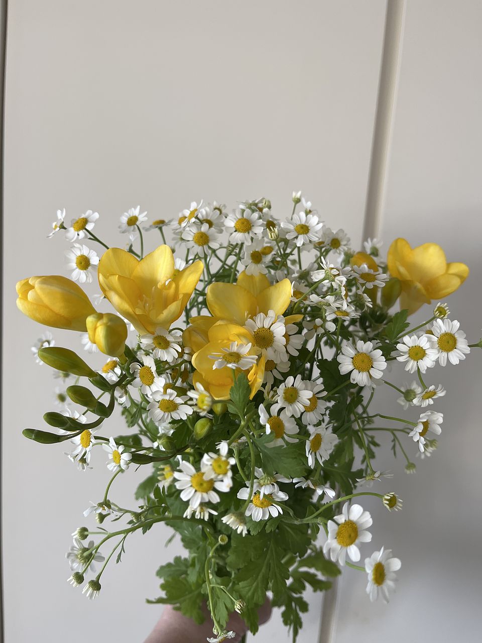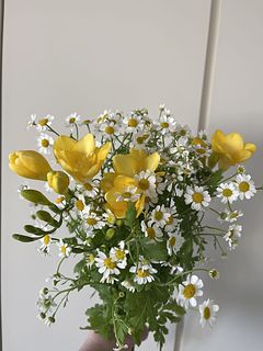 飾るときのポイントは、マトリカリアの下葉を少し取り、空気が通るようなイメージでやさしくほぐしながら広げるのがおすすめ。
