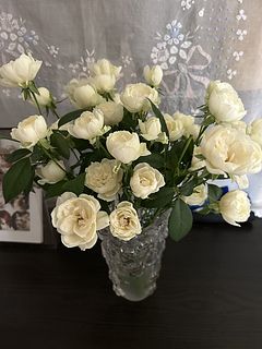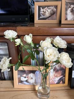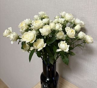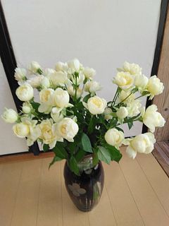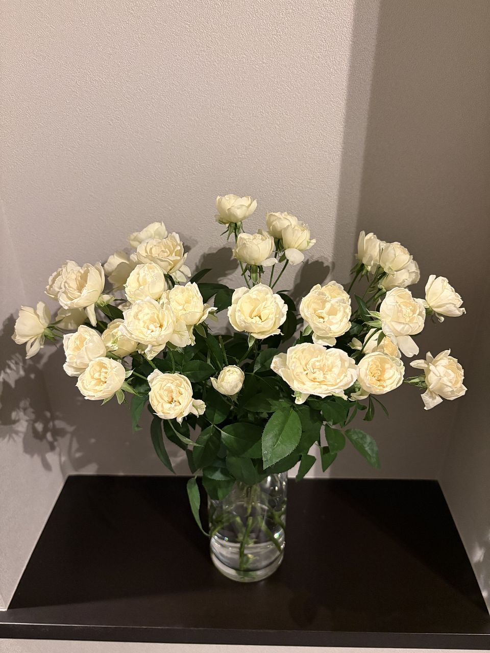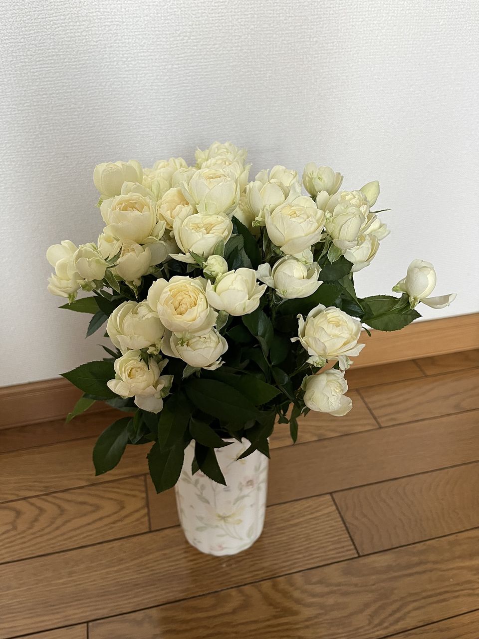 とてもボリュームがあり、可愛らしいバラでした。 1番花の咲いていたところは花が摘んであったので切ってから水切りして活けました。 2日目くらいから水替えをする際にハラハラと花弁が落ち始めていますが、満開までいけそうです。 生花店では濃いピンクしか見かけませんので、白は珍しくきれいでした。