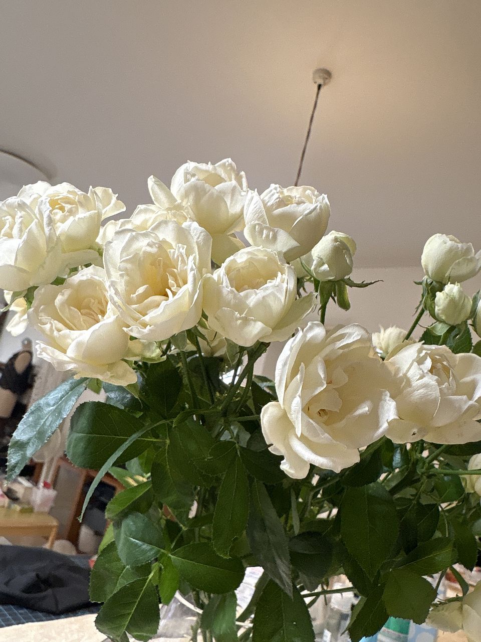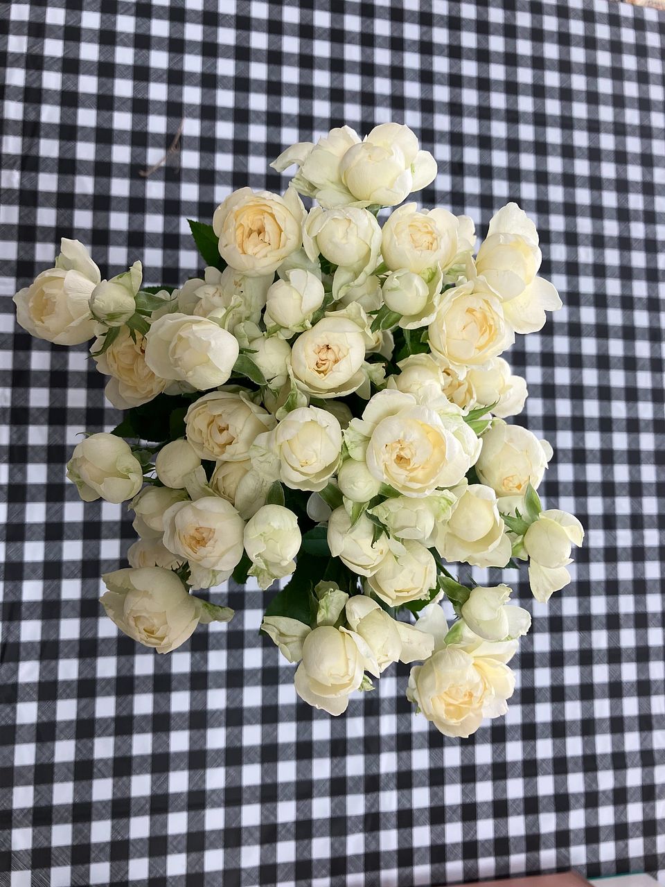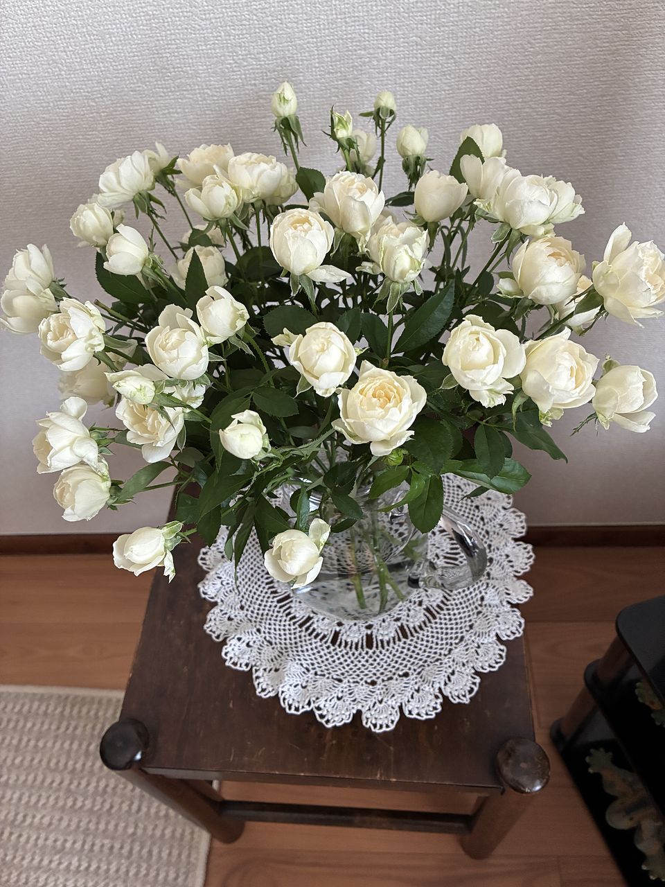 小ぶりな白いバラ、とっても可愛いです。 ブーケの様な感じで束ねて、テーブルに飾ってみました。