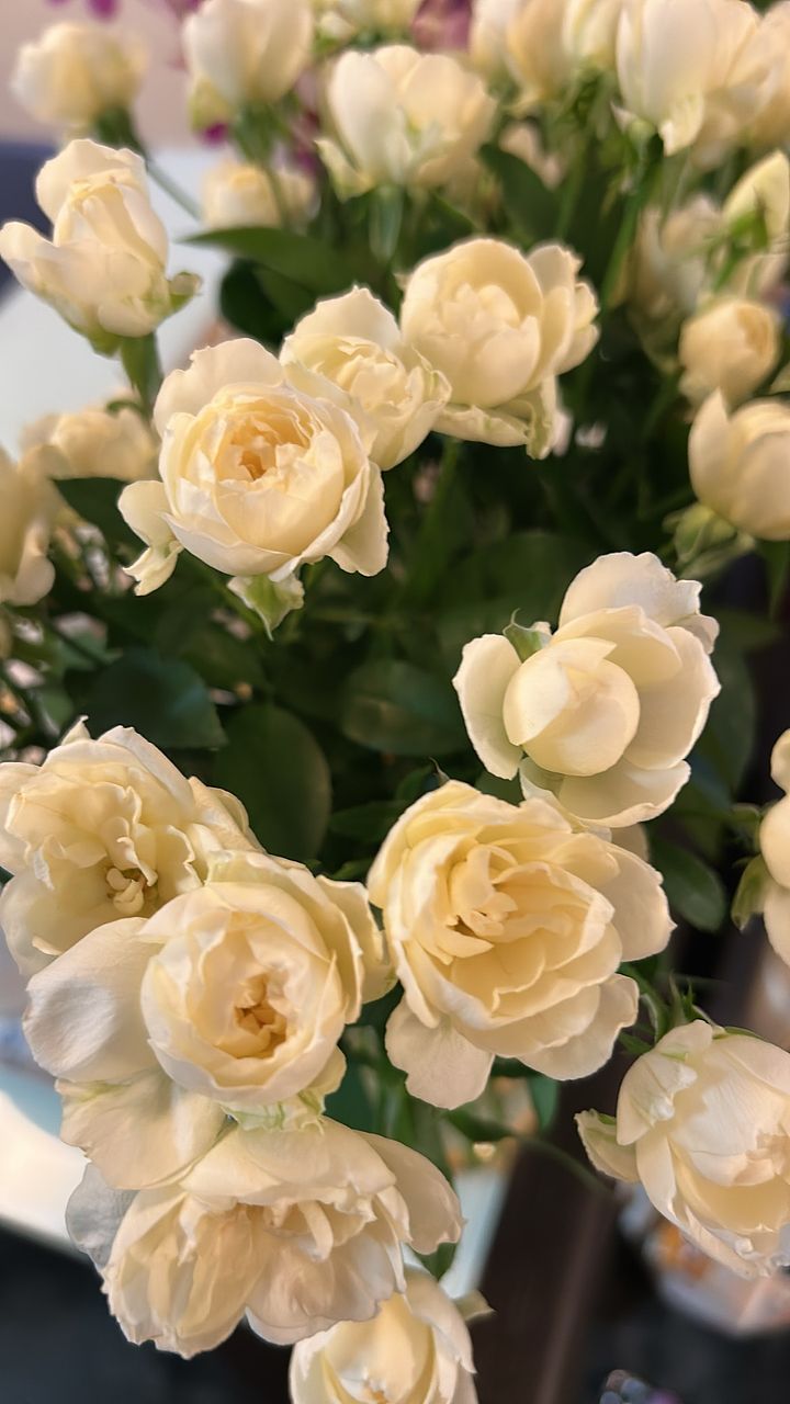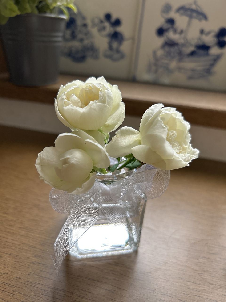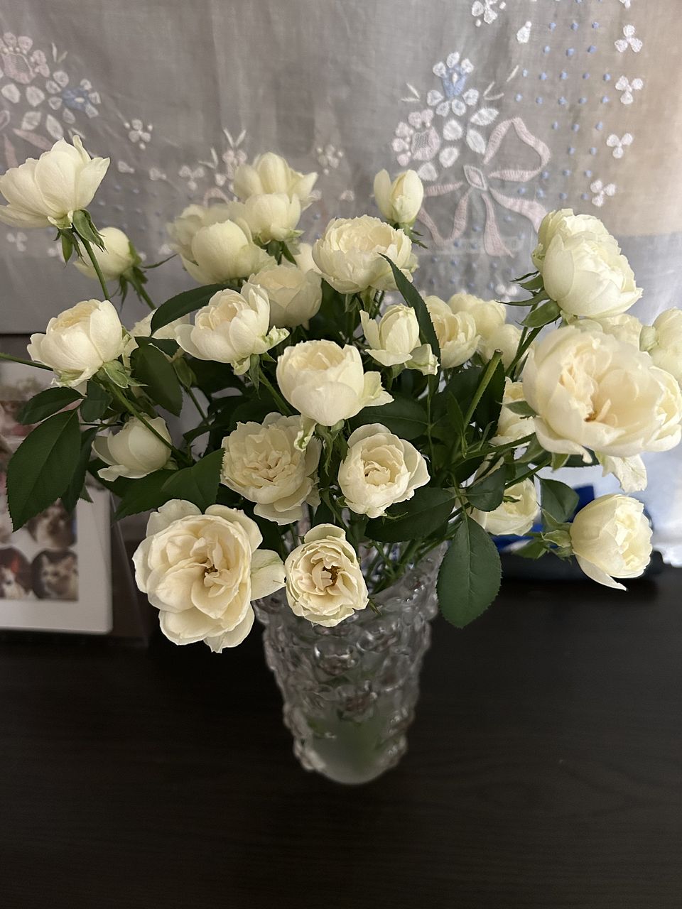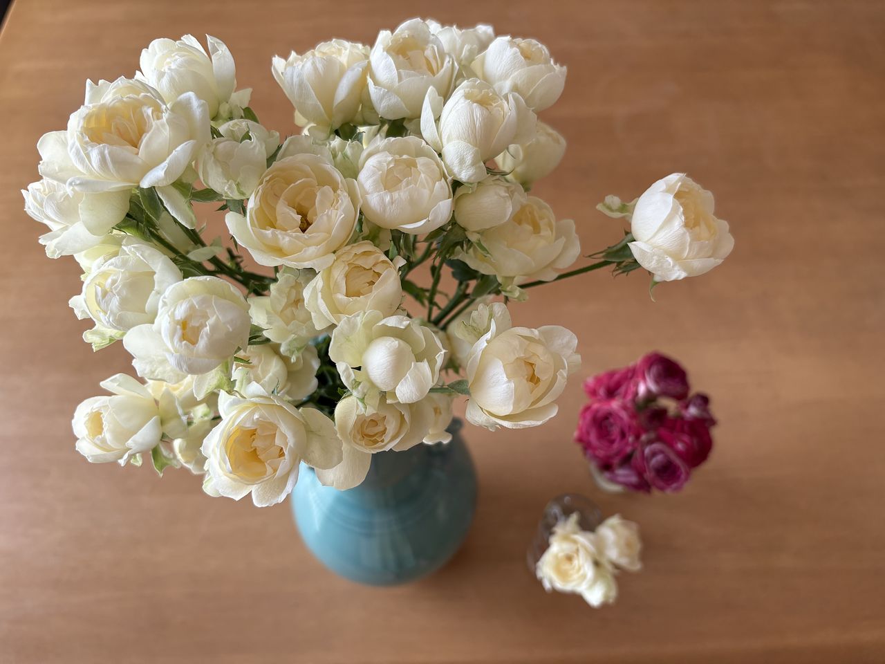 小ぶりな白いバラ、とっても可愛いです。 ブーケの様な感じで束ねて、テーブルに飾ってみました。