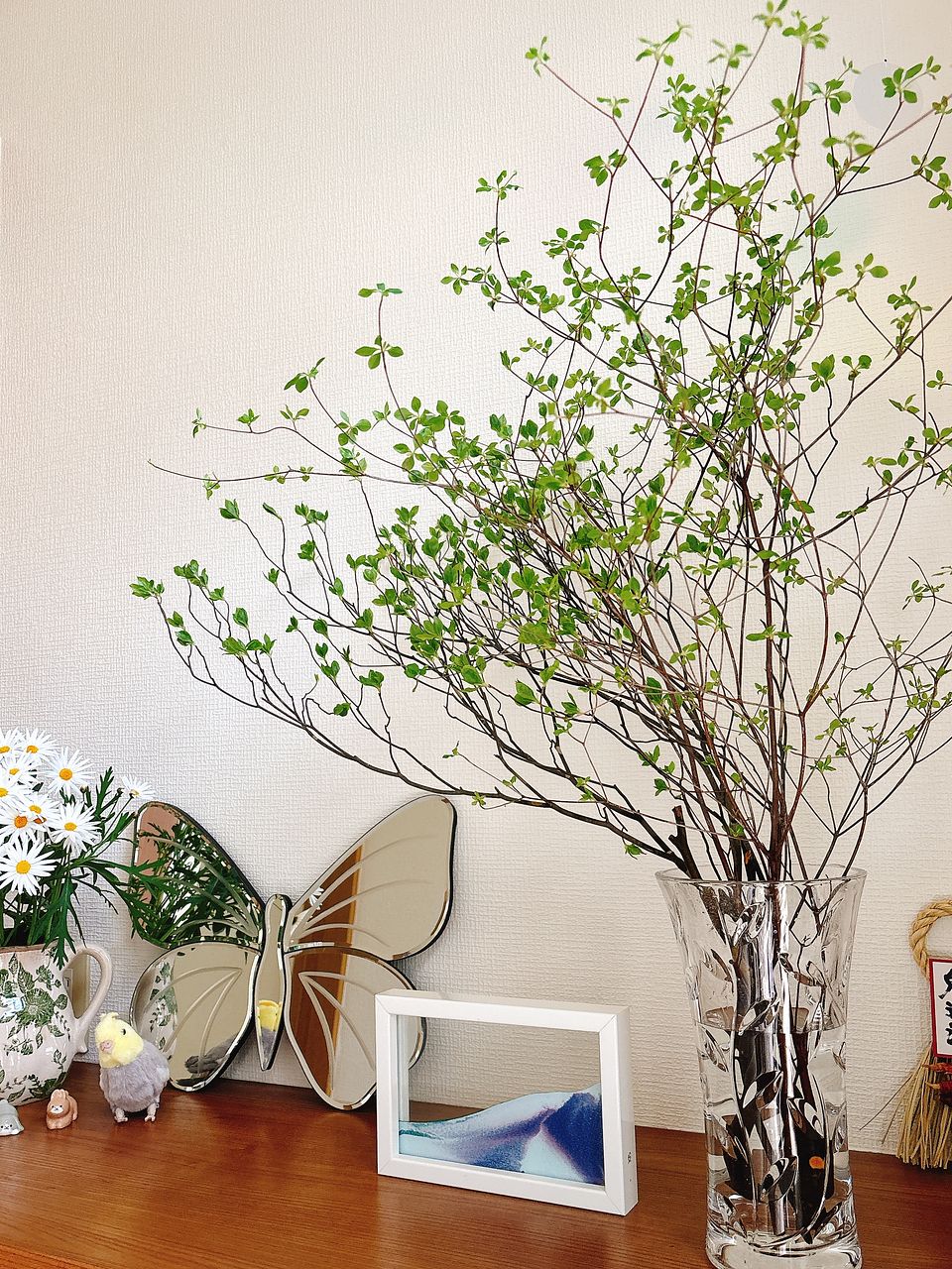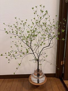 4本入っていました。太めの枝が1本と細い枝が3本 太めの枝のものは一本で花瓶に生けて玄関に。 残り3本はまとめて生けてリビングに。 これから葉が大きく開いていくと思うので楽しみです。