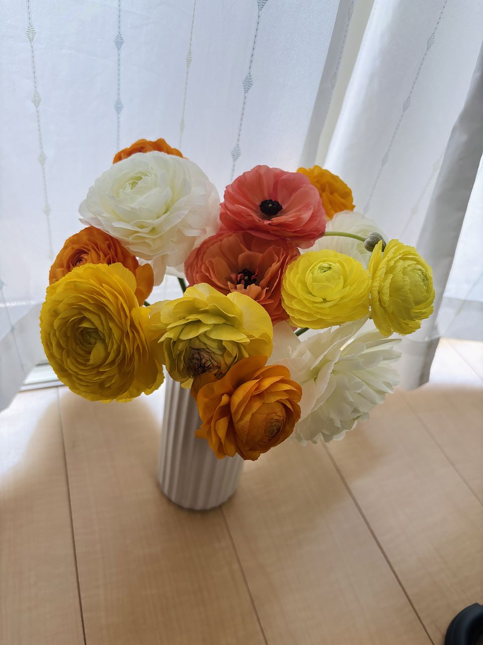 箱を開けた瞬間、きっと「かわいすぎる!」と声が漏れてしまうかも?シトラスカラーのおしゃれなラナンキュラスをたっぷり12本束ねました🧡💛🤍