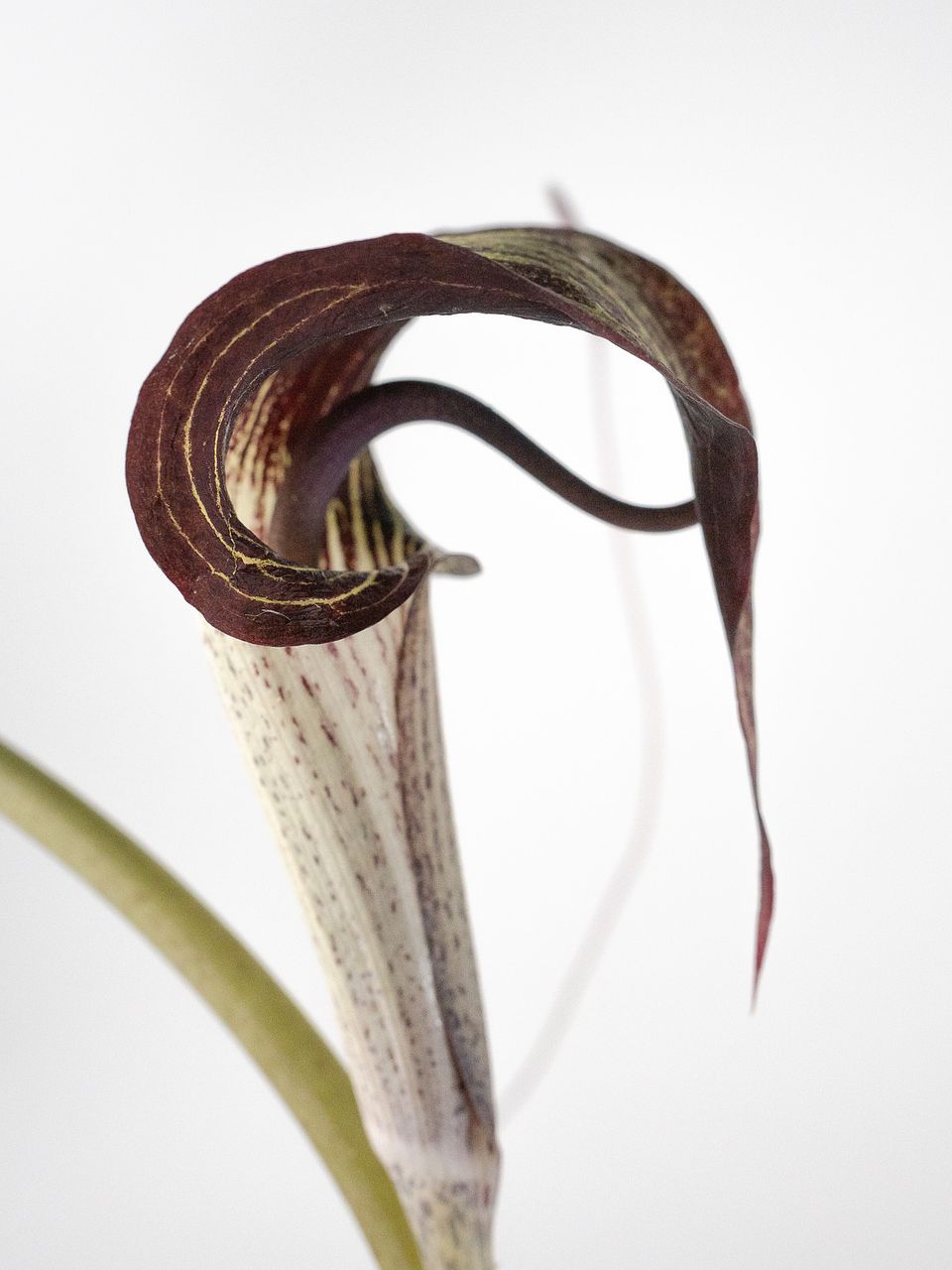 ウラシマソウはサトイモ科の植物で、細く伸びる糸のような部分が特徴的な浦島草。