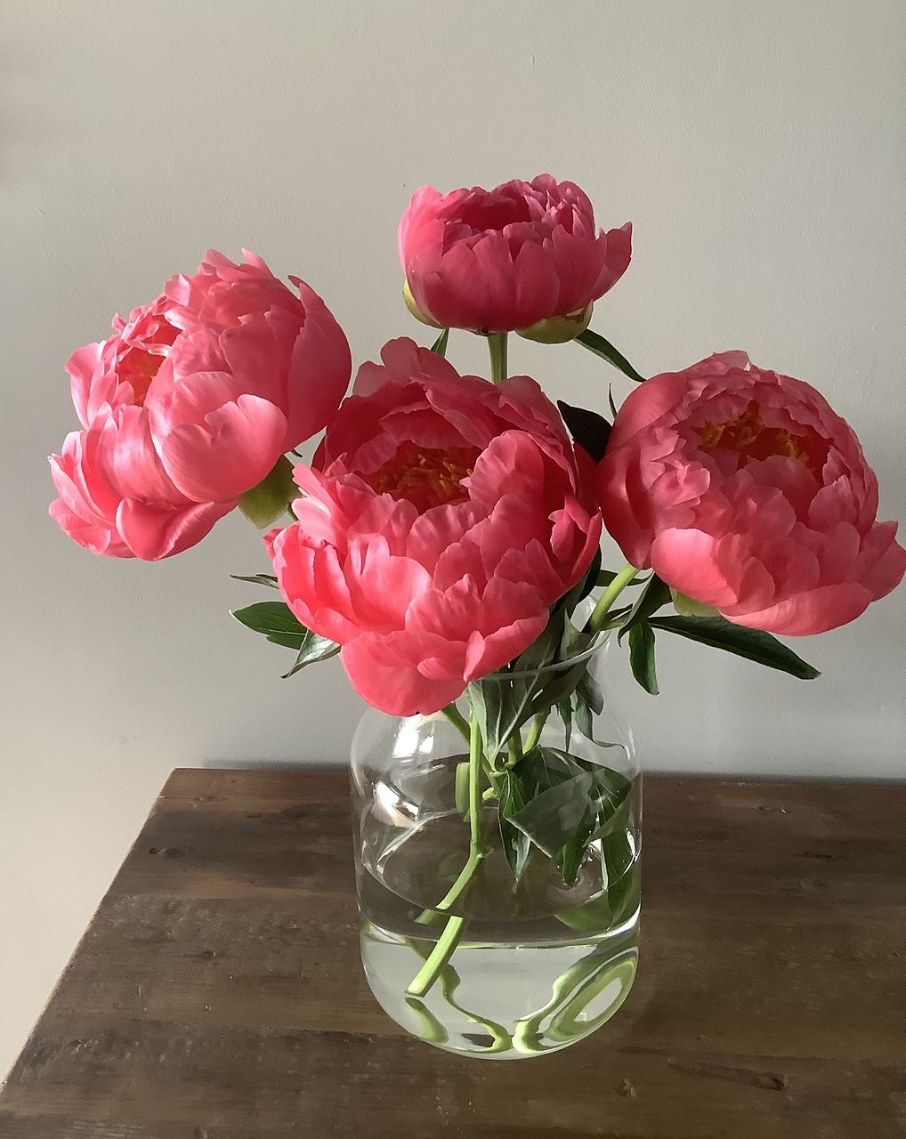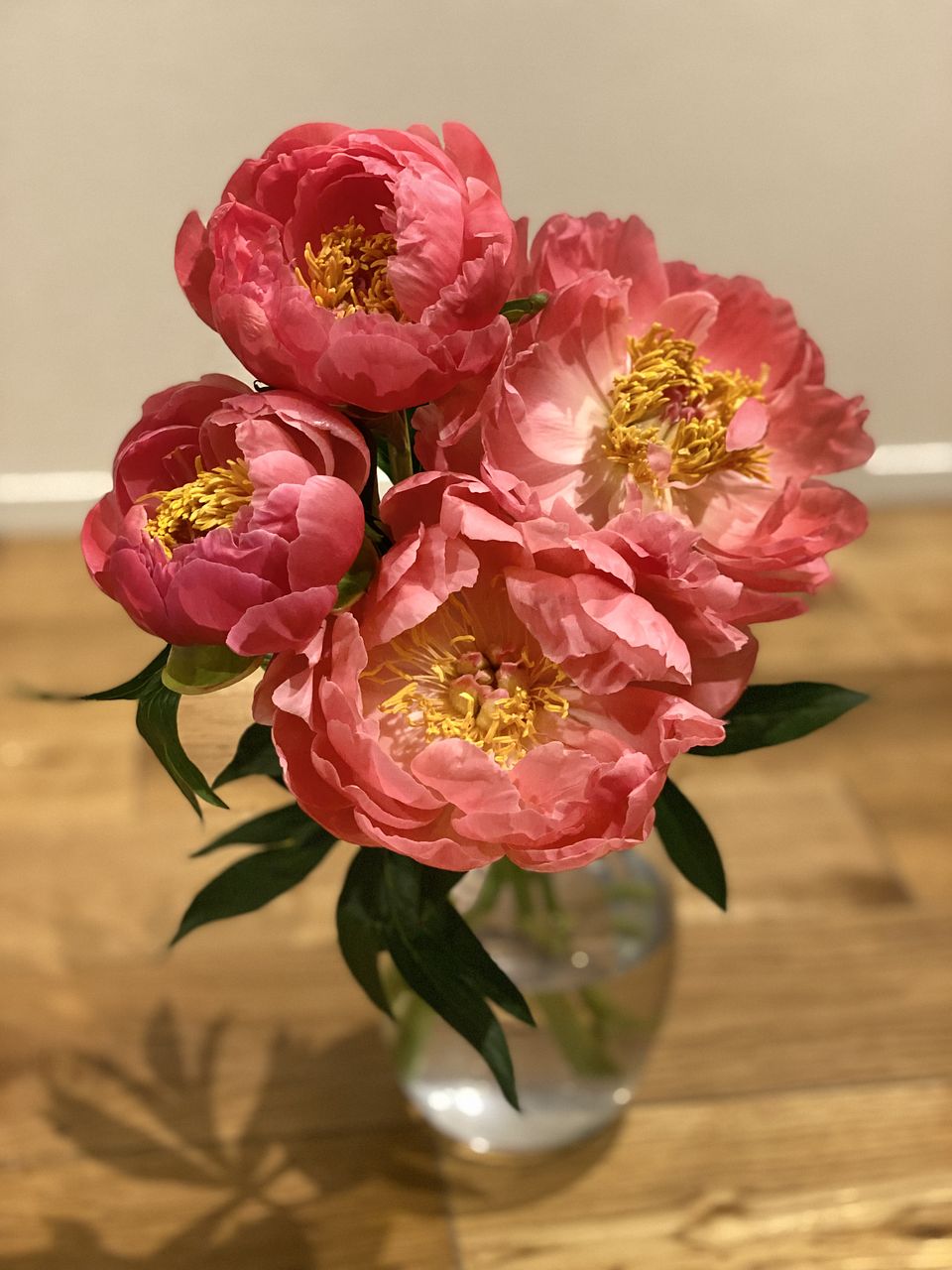 昨夜5本届いて、一つは咲きそうな感じで残りは蕾でしたが、数時間で咲きそうだったものは開花しました。そして、今日、蕾だったものも全て咲きました。花びらが少なめの芍薬の種類なので簡単に咲いたのかなと思いました。ただ、写真よりも花は小ぶりに感じました。色は素敵なサーモンピンクで、蕾から咲き初めの時は濃い色のピンクでした。