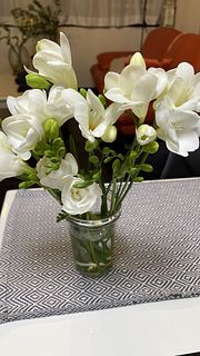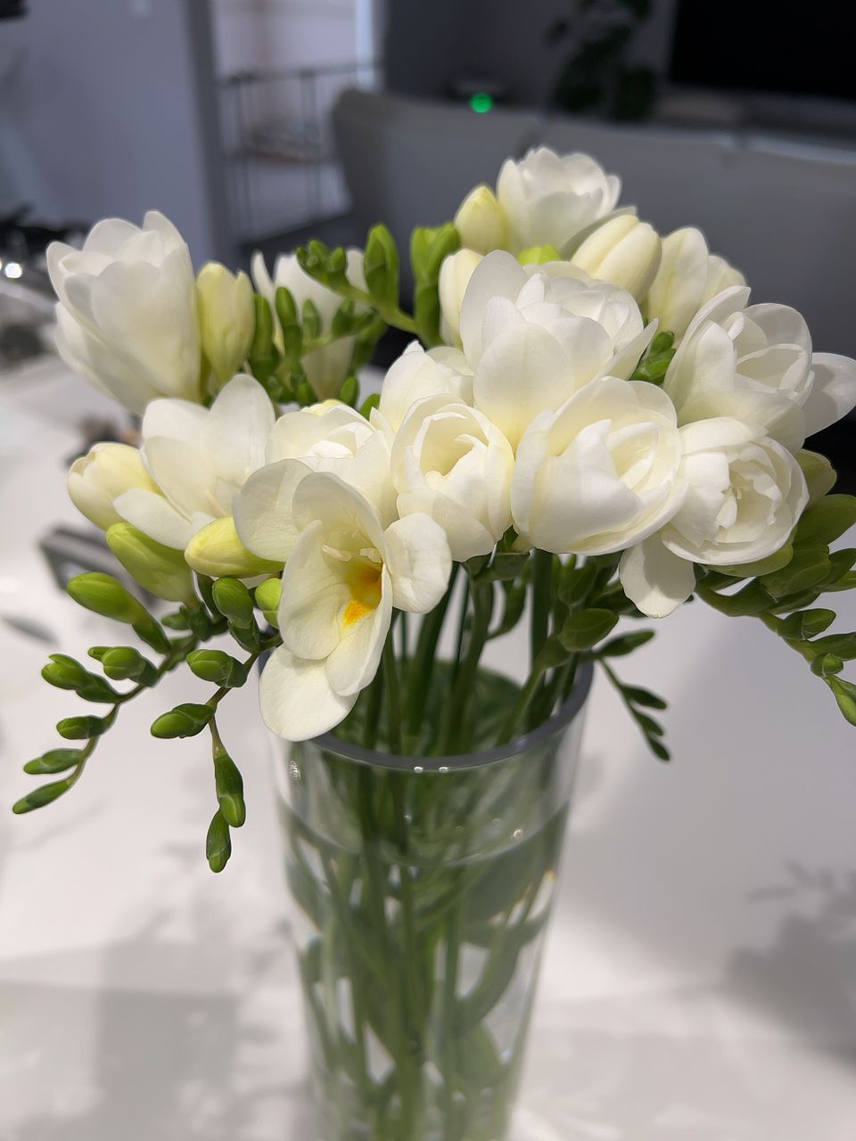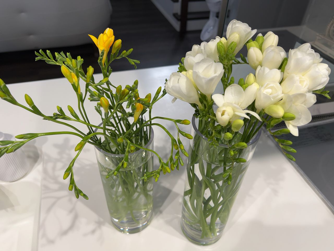 ずっと待ってたホワイトのみのフリージア! 茎がしっかりしていて蕾も大きくとても綺麗です。 八重と一重で香りが全然違い、一重の方が甘く優しい王道の香りがします😊 八重はややスパイシー?でちょっと青臭いです😅 花姿はどちらも綺麗で満足してます。 玄関用にと同時に購入した黄色いフリージアが期待はずれな状態だったので、急遽ホワイトを玄関に飾ることにしました。 水揚げも順調のようで蕾の先端までしっかりハリがあります。