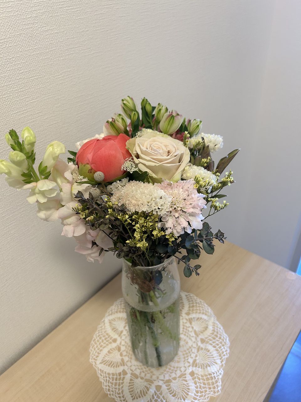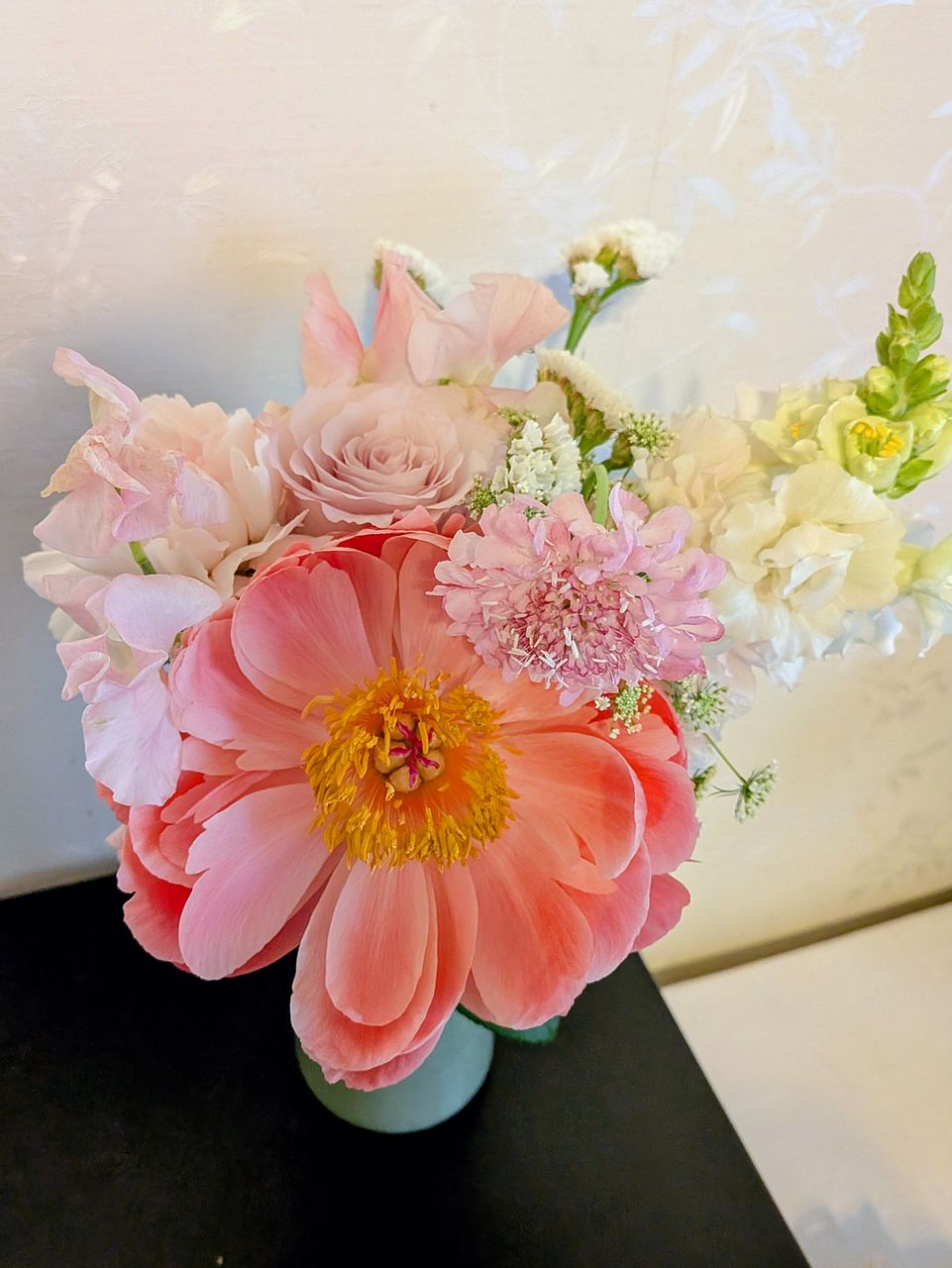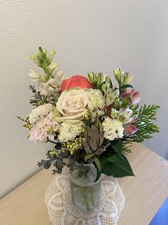芍薬がとてもインパクトがあって引き立って美しいです。他のお花は可愛くて全体が愛らしいアレンジメントができてキュンとなりました。