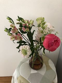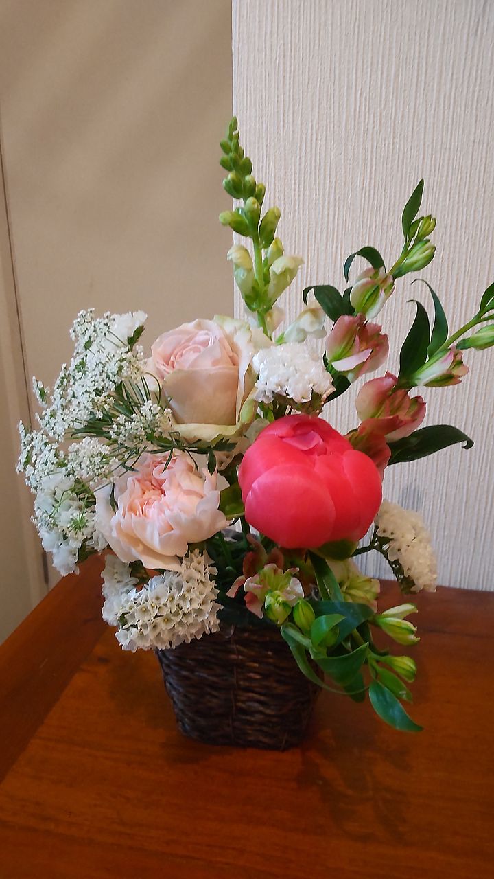 芍薬好きな義母宅へ、お花の処理を済ませて活けに行きました。 日中に開いていた芍薬のが夜になると閉じて、また朝になると開く様子が可愛いと、喜んでおりました。 芍薬の他にも添えになる色々なお花が入っているのも、良かったです。 いつもありがとうございます!