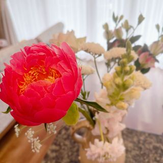届いた時は少しボリュームも少なく、ピンク感が少ないな…と思いましたが、芍薬が咲いたら、すごく華やかで可愛い感じになりました! 初めての芍薬で咲いてくれるか緊張していましたが、水揚げをしてる間から少しずつ開き出して、花瓶に移した段階でもうキレイに咲いてくれてました。おうちが華やかになってとてもテンションが上がりました。