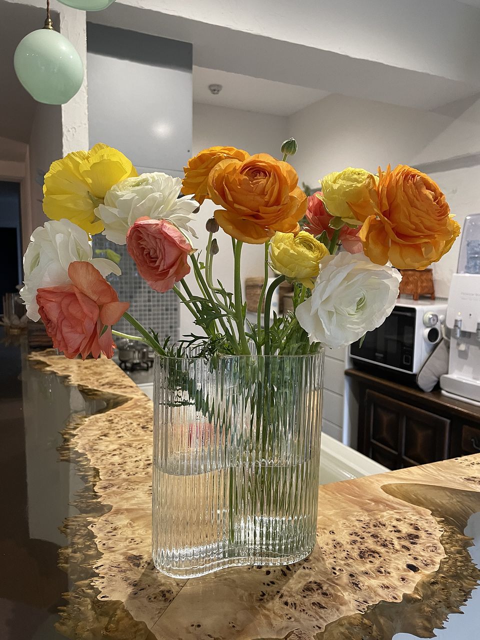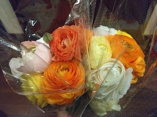 シトラスカラーのラナンキュラスが、ボリュームいっぱいで、2つの花瓶に生けました。 輸送途中で一本首が折れていたのですが、商品説明にある通り、こういう事態を見越して、1本余分に全部で13本入っていました。首が折れたものは、小さな一輪挿しに入れて楽しんでいます。