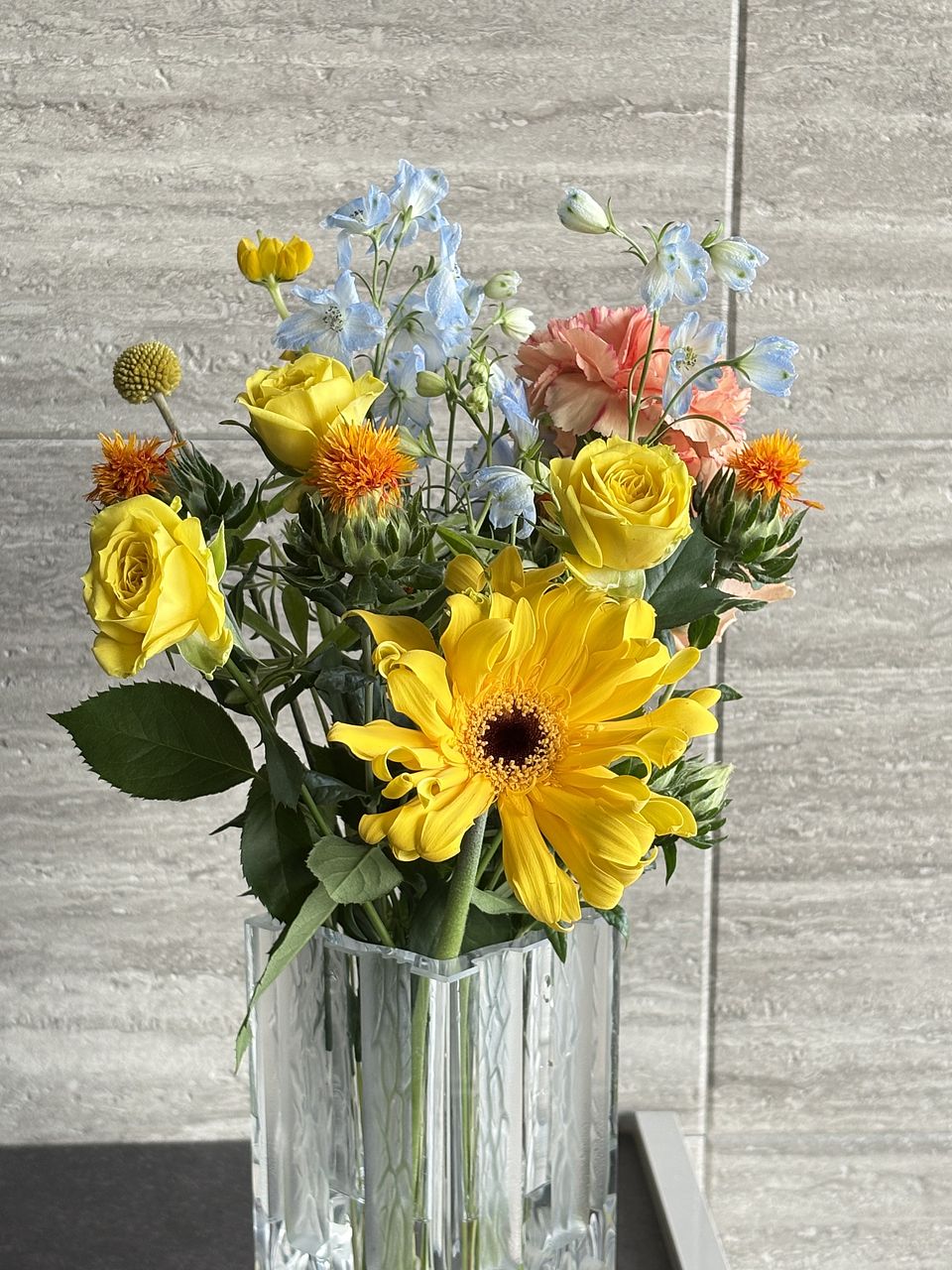 清涼感のあるブルーとジューシーなビタミンカラーのお花を組み合わせたおまかせブーケ🍋🍊