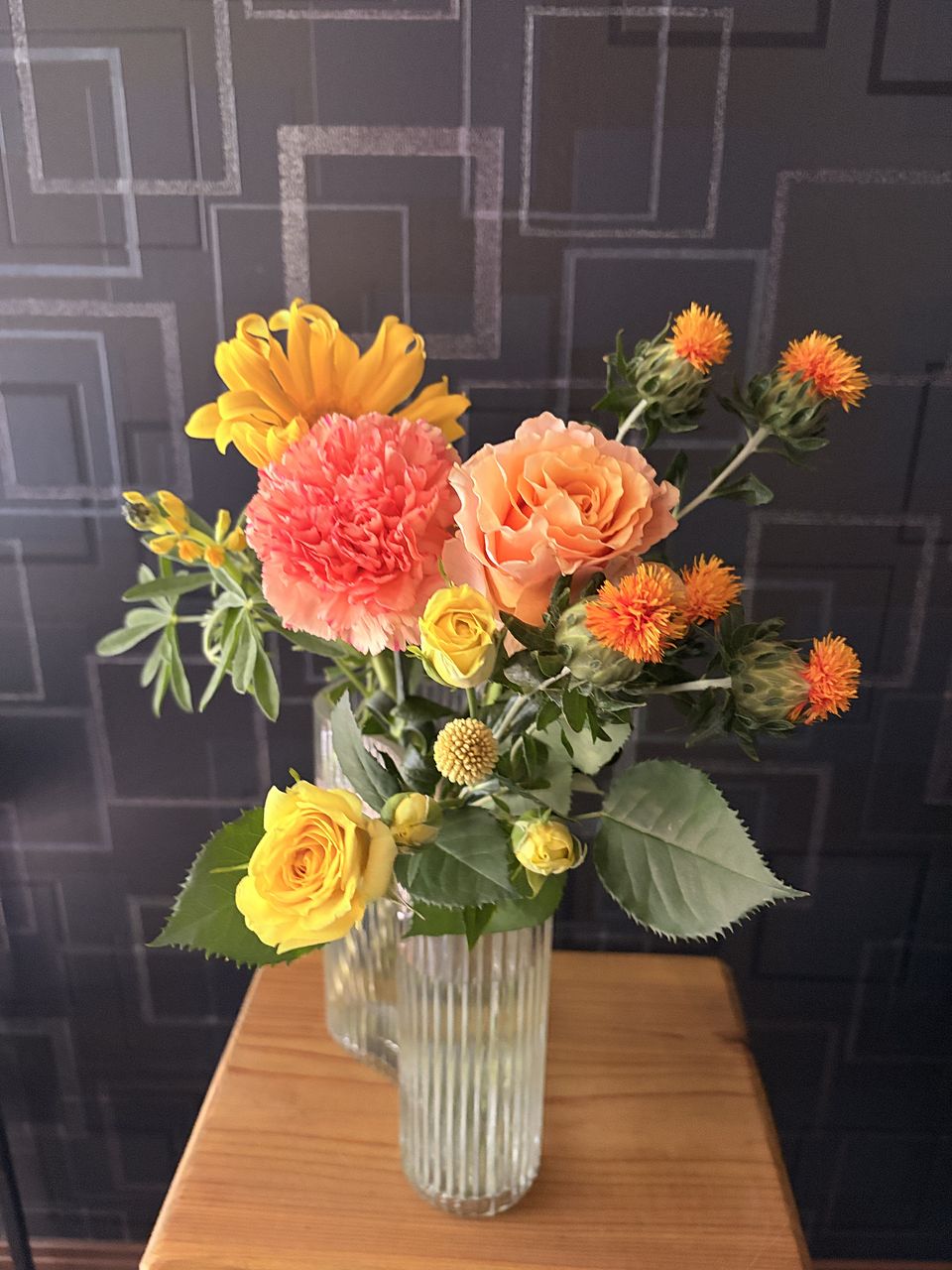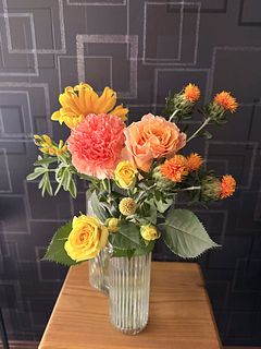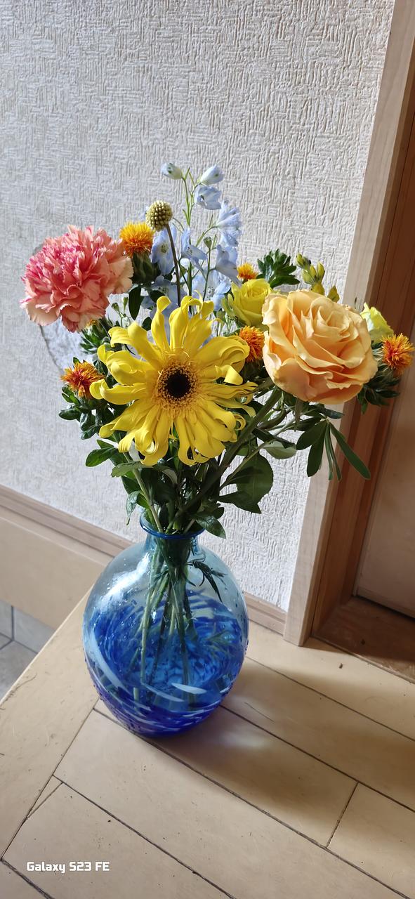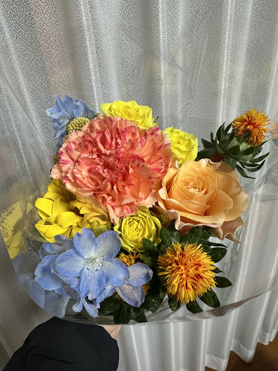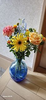 バラ3本(黄色1、黄色スプレー1、オレンジ1) 、ガーベラ1本(黄色大きめ)、マリーゴールド1本(濃いオレンジ)、アルストロメディア1本(薄黄色 小ぶり)、カーネーション1本(薄オレンジ)、クラスペディア1本、デルフィニューム2本(普通の薄青)