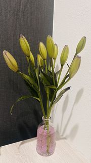 母が大好きだった百合、しかも大好きだった紫色のこちらの花を、四十九日に合わせて購入しました。 届いた時は全て蕾で、お手入れ方法に沿って水上げを行っている最中からジワジワ蕾が開いてくる子が!😳 数時間後にはチューリップ程の開き具合になり、早速に楽しめました🥰 色合いも、濃すぎず薄すぎず、柔らかい紫色のグラデーションが上品でとっても素敵です。 購入して良かった…母もきっと喜んでくれているはずです。ありがとうございました。