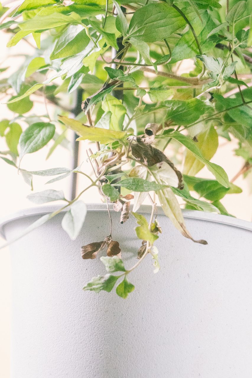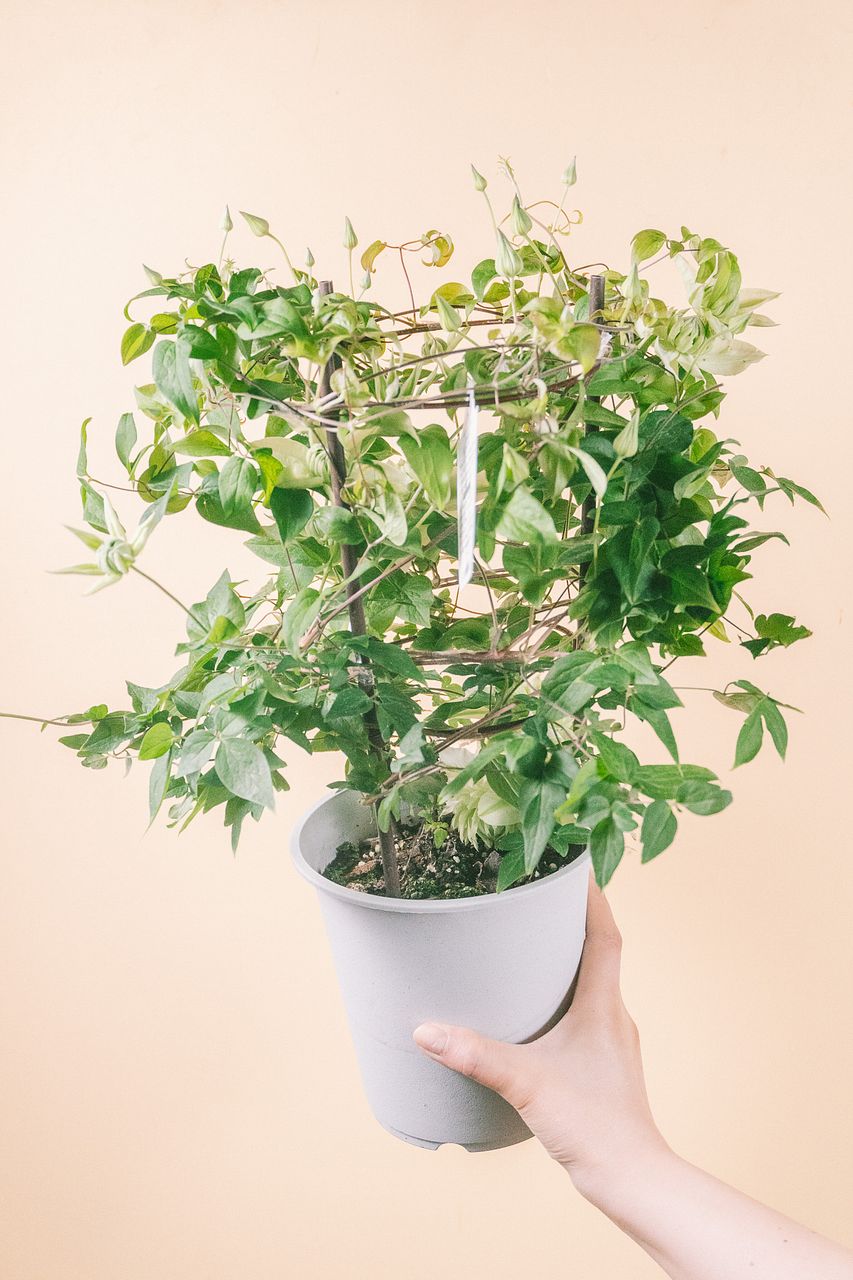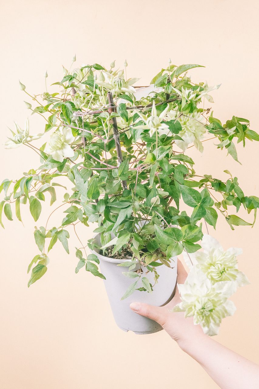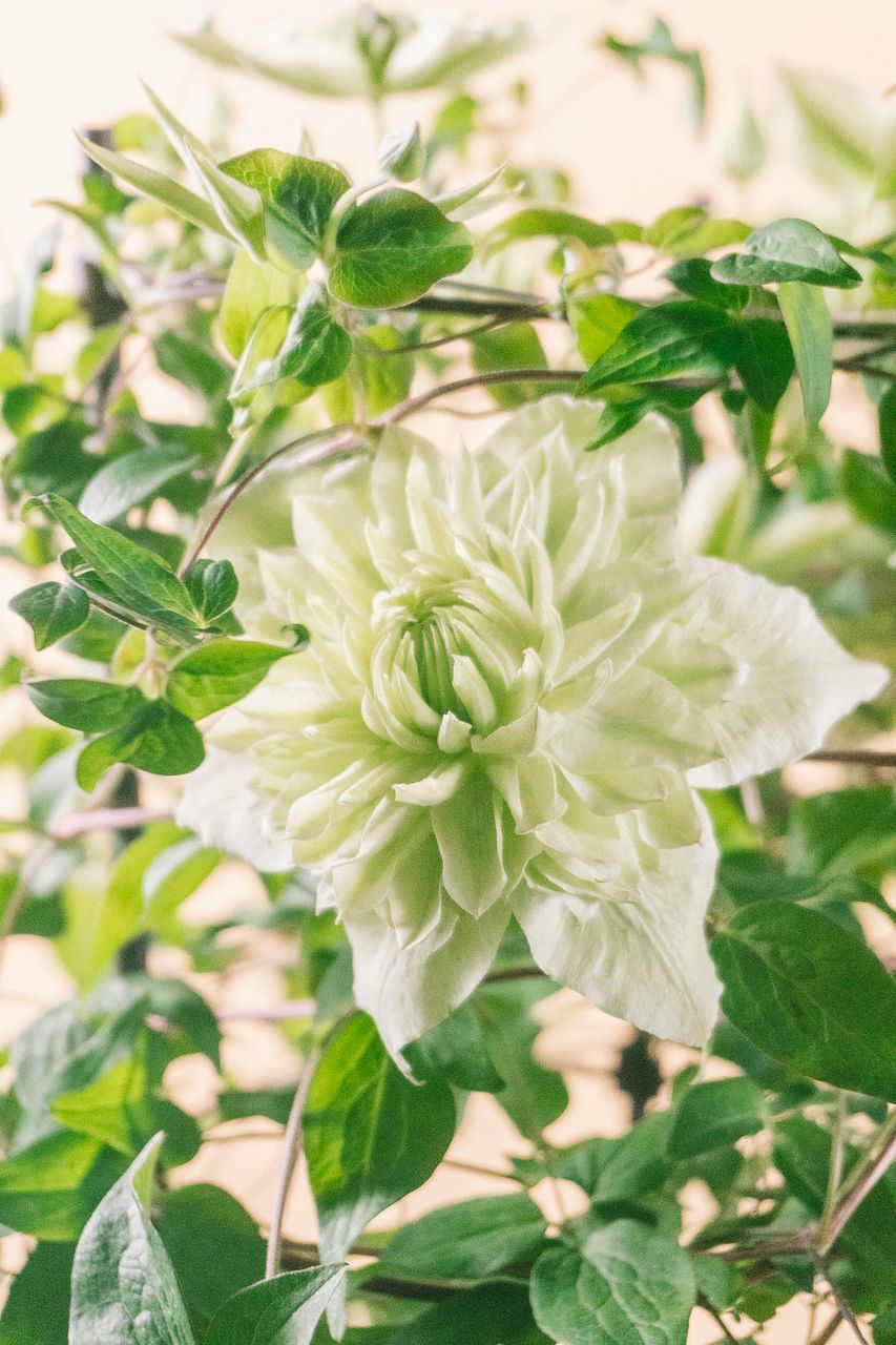 淡い黄緑色から白色へ変化する八重咲きの花が特徴のクレマチス。変化していく色の移ろいも楽しめます😉