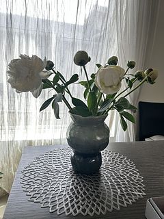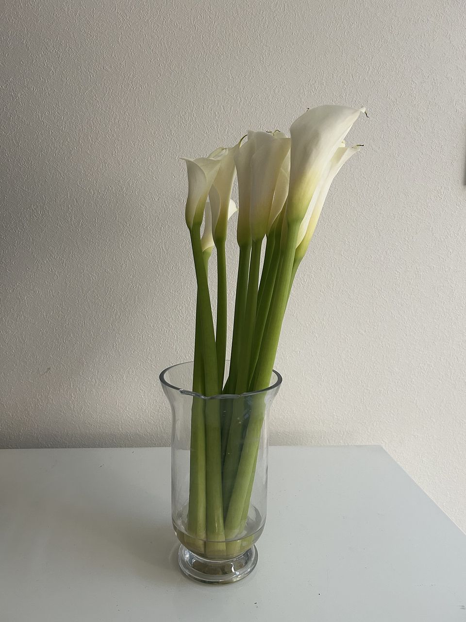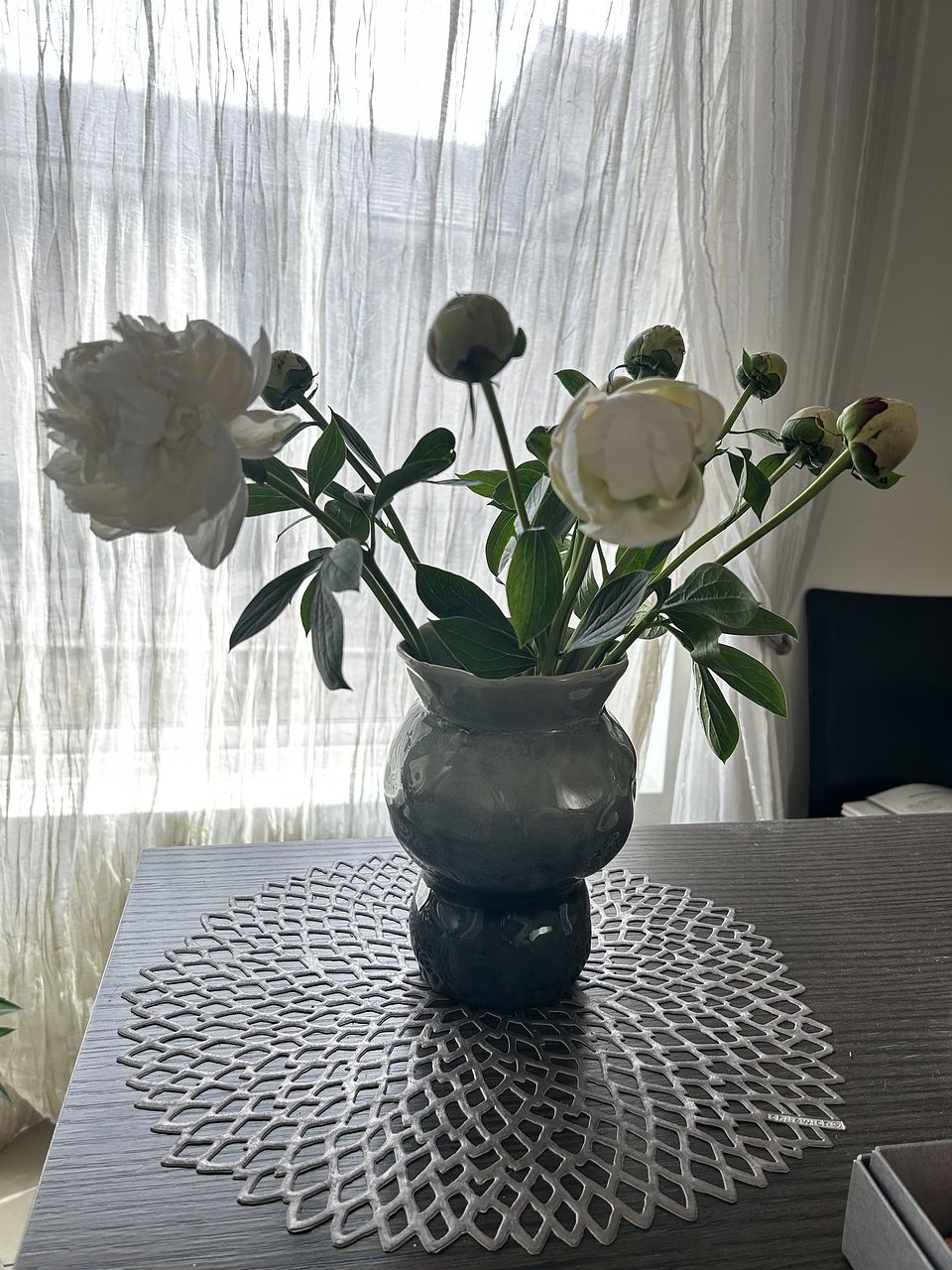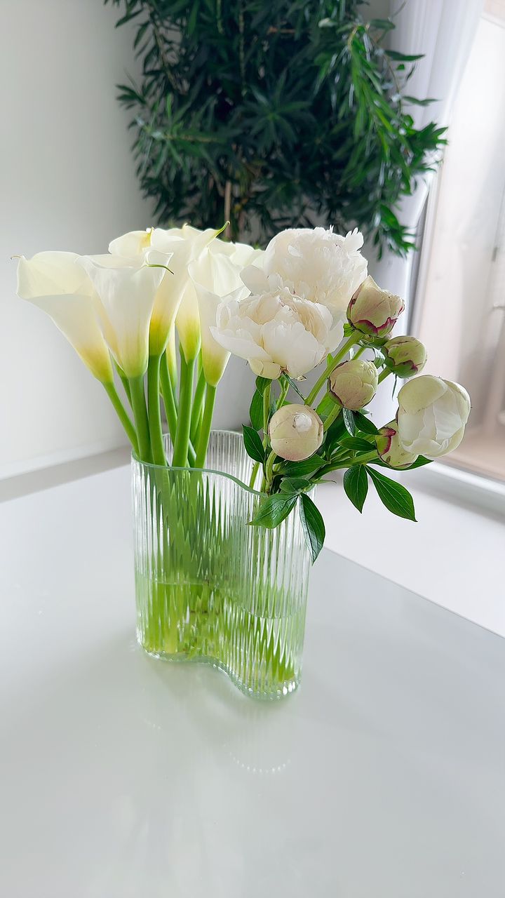 カラーも10本もあると花瓶にバサっと入れただけでとても大人な雰囲気で素敵です💖 芍薬は小ぶりでまだ蕾が固いですが、お手入れがんばってたくさん咲かせたいです✨ 芍薬はagataのブルーに生けました😍 白い蕾と葉っぱのグリーンがブルーのagataに映えます。 生き生きとした元気な芍薬でした。