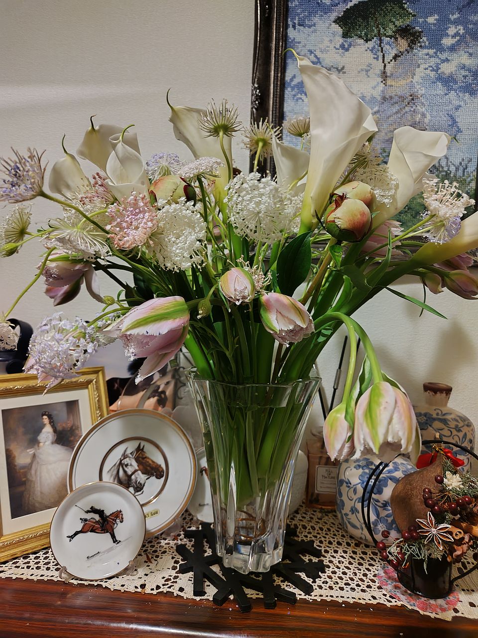 カラーも芍薬も短めで丁度良かったです。芍薬の蕾は街の花屋さんから聞いて水をかけたので、開いてくれる事を期待してます。同日到着したチューリップとまだもっていたスカピオーサも併せました。芍薬が開いたらバランスを見て分けようと思います。柔らかな色合いが好みです。