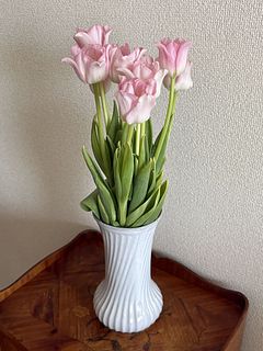 柔らかいピンクの可愛いチューリップが届きました。鮮度も良く暫く楽しめそうです。