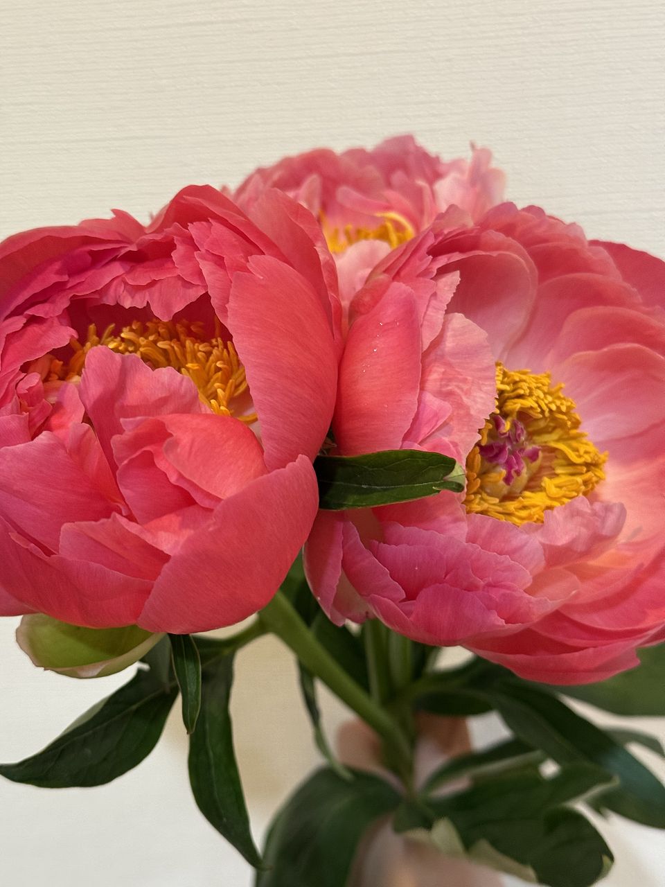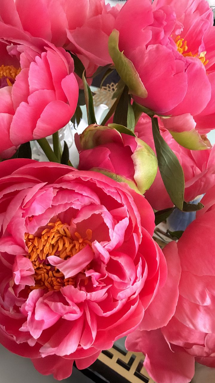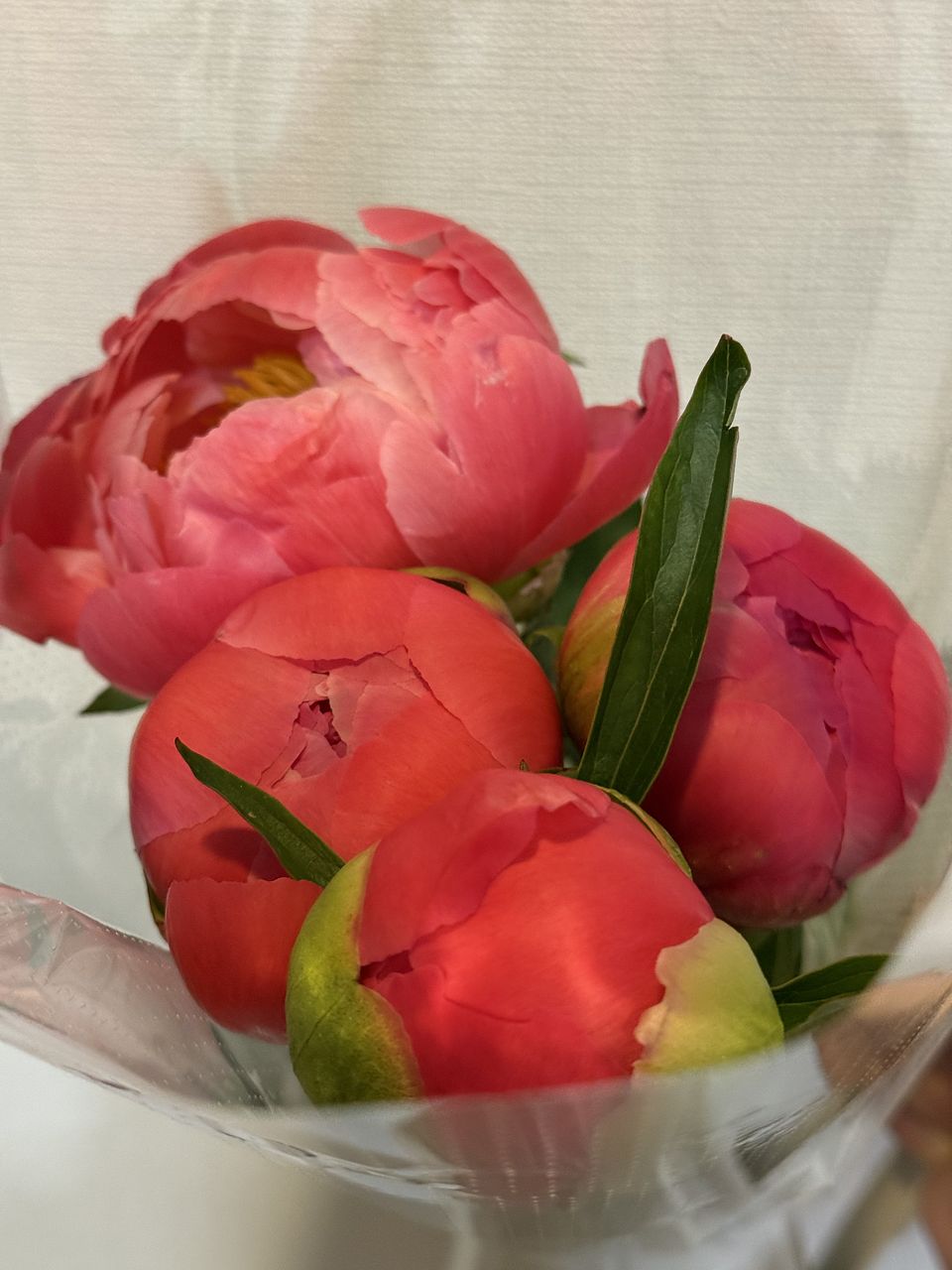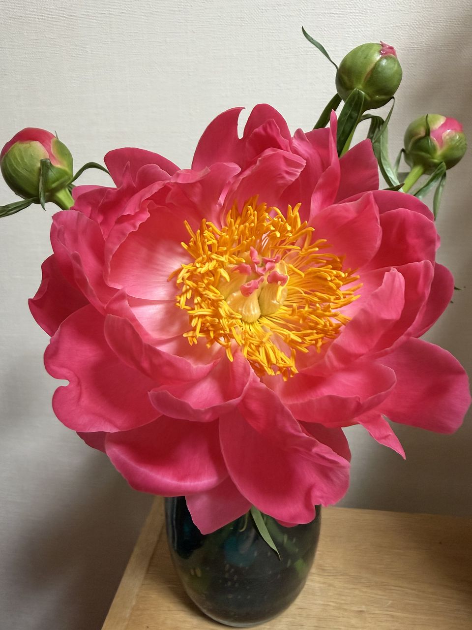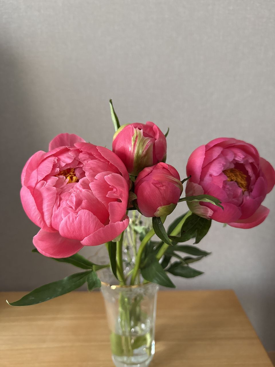 昨日届いた時は蕾が3輪、開きかけが1輪、元気な状態で届きました♪固い蕾の状態ではなかったので、蕾は触らずに水揚げだけしっかりして、北側の涼しい玄関に置きゆっくり開花するのを待っていました☺️ 今日1輪が完全に開いたので、1番目にしやすいキッチンに、3輪はやや涼しいリビングに置き、それぞれ開花のタイミングをゆっくりさせる為に場所を選んで置いてみました。 この時期を一年で一番心待ちにしている位、芍薬は大好きな花です。芍薬を楽しむようになって15年程になり、自分でも黒岩の芍薬を鉢で育てるくらい大好きです💕エッジドサーモンが私の大好きな品種NO.1なので、今年は何回飾れるかしら?と今から楽しみです♪😊