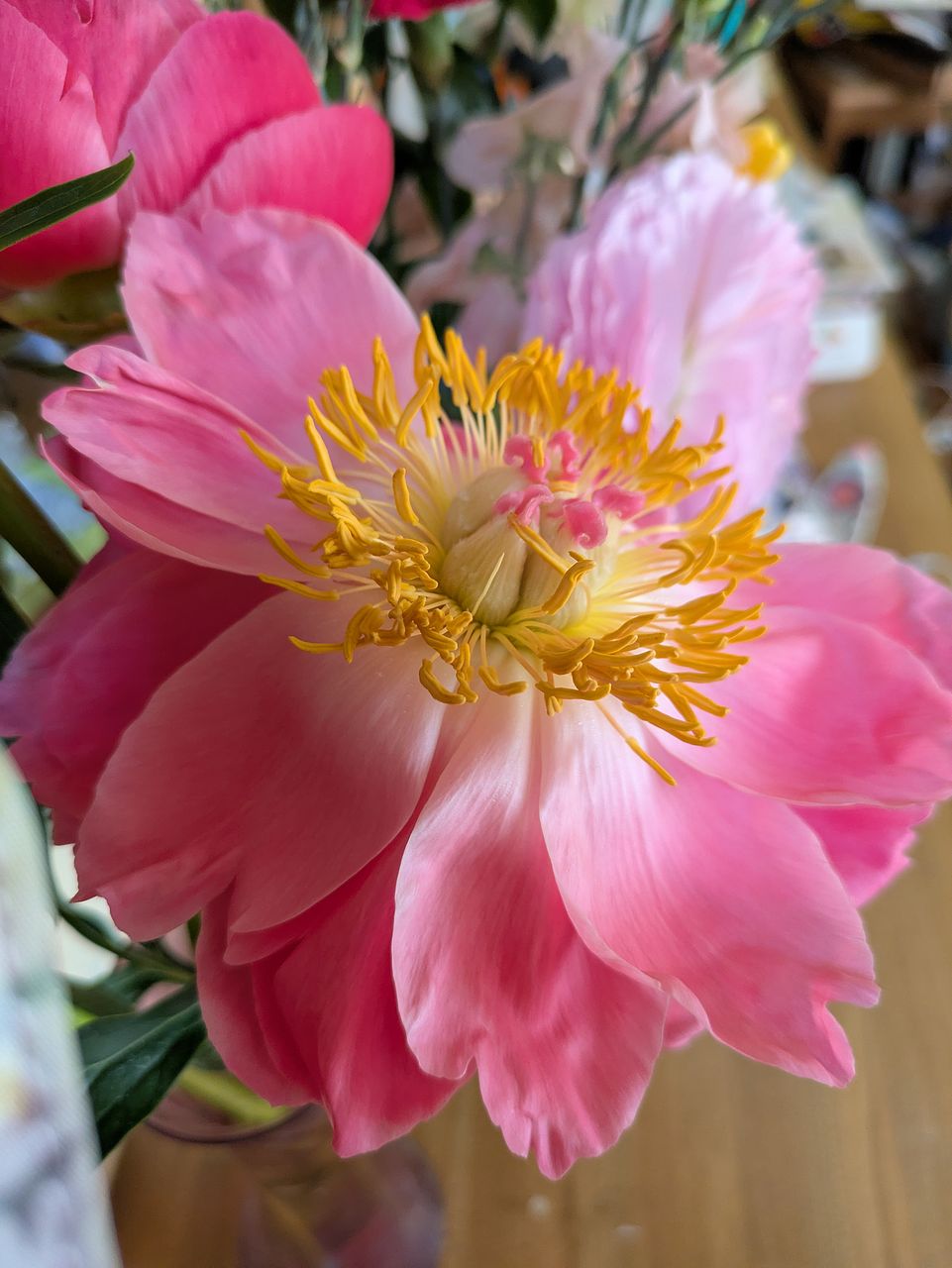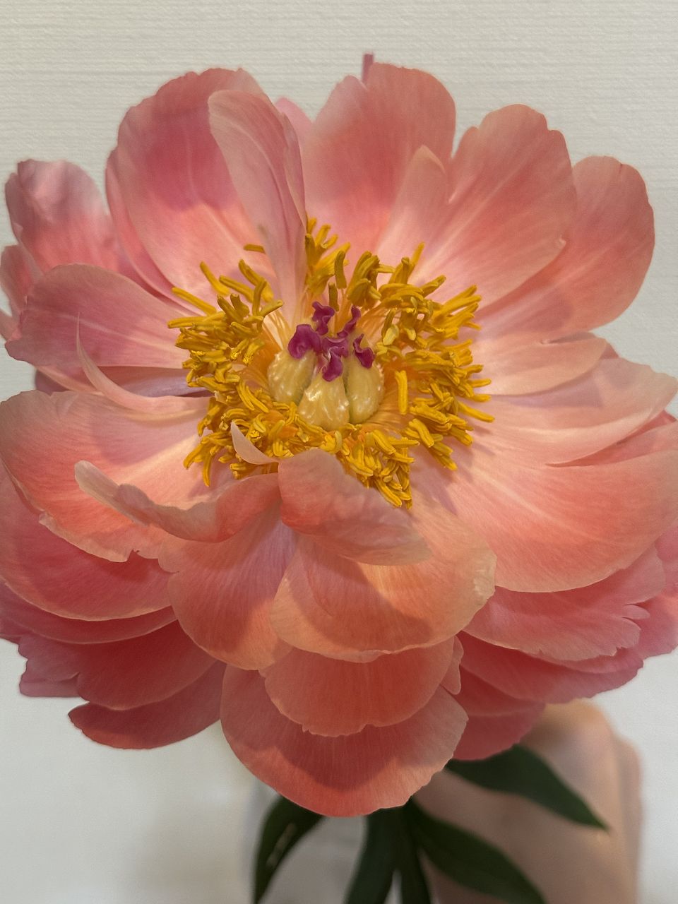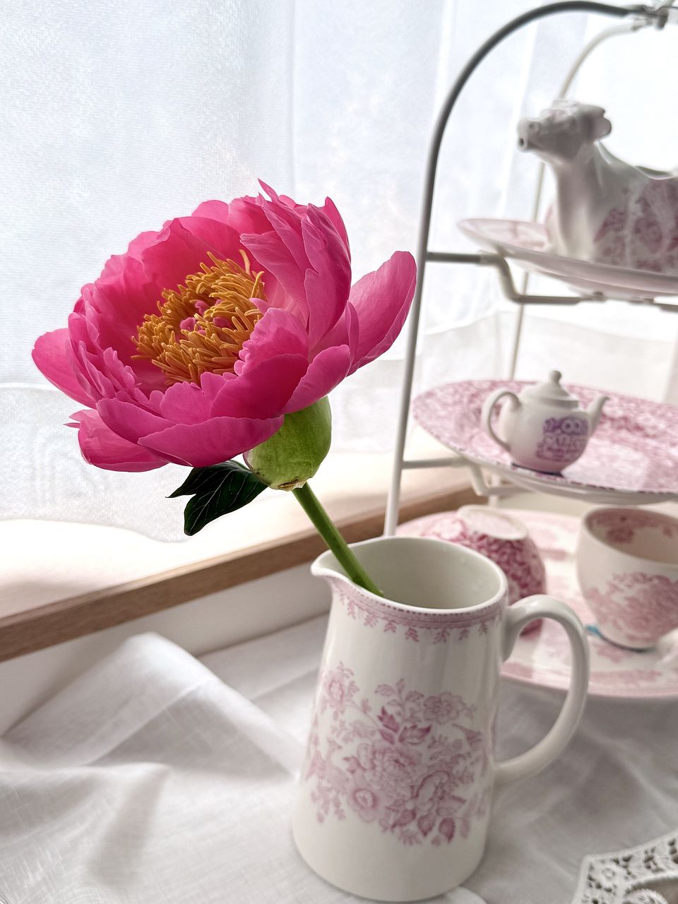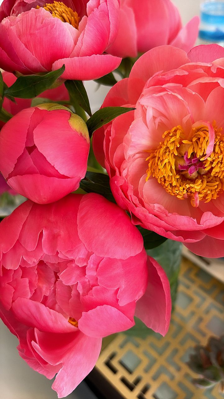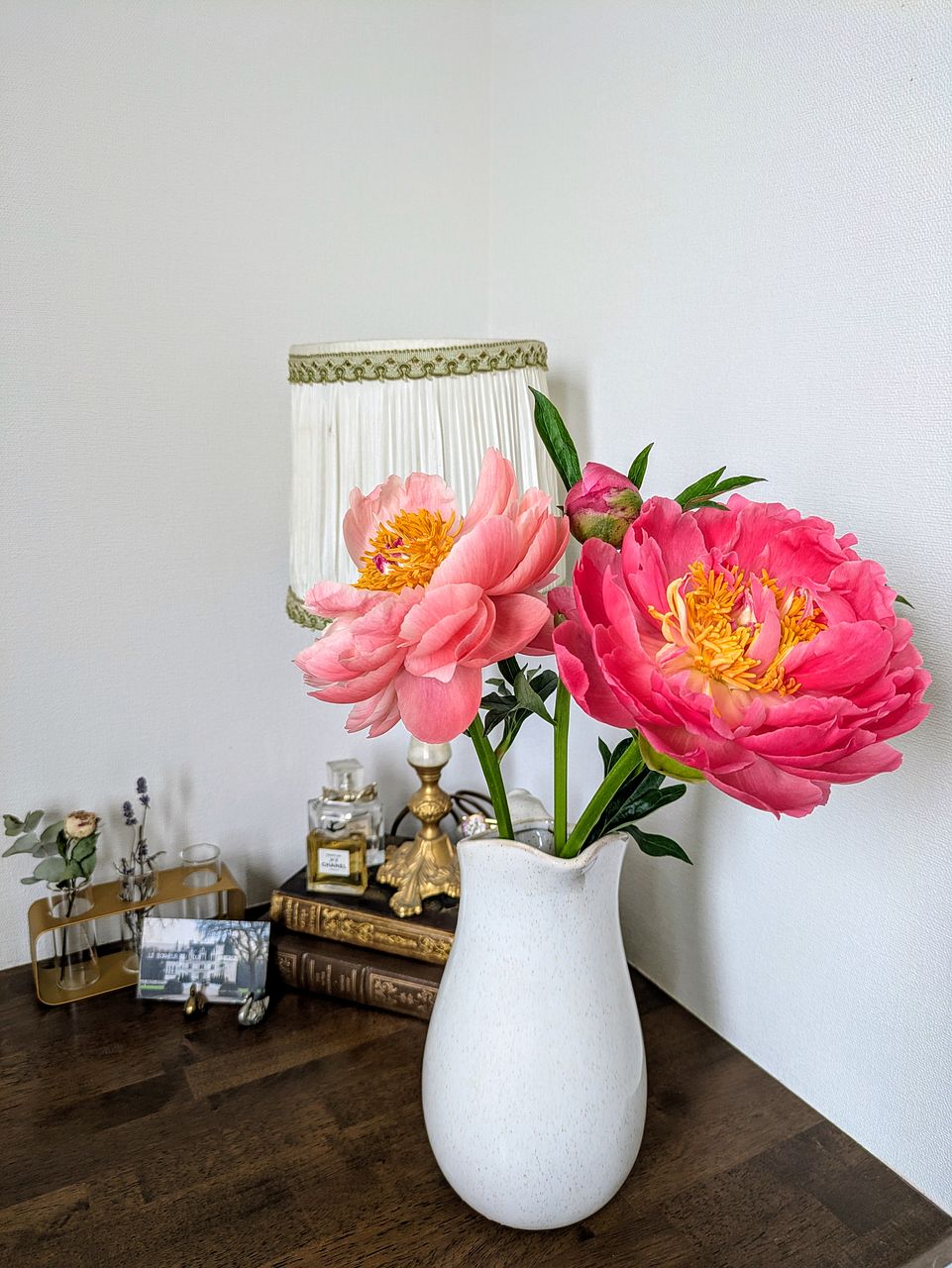 昨日届いた時は蕾が3輪、開きかけが1輪、元気な状態で届きました♪固い蕾の状態ではなかったので、蕾は触らずに水揚げだけしっかりして、北側の涼しい玄関に置きゆっくり開花するのを待っていました☺️ 今日1輪が完全に開いたので、1番目にしやすいキッチンに、3輪はやや涼しいリビングに置き、それぞれ開花のタイミングをゆっくりさせる為に場所を選んで置いてみました。 この時期を一年で一番心待ちにしている位、芍薬は大好きな花です。芍薬を楽しむようになって15年程になり、自分でも黒岩の芍薬を鉢で育てるくらい大好きです💕エッジドサーモンが私の大好きな品種NO.1なので、今年は何回飾れるかしら?と今から楽しみです♪😊