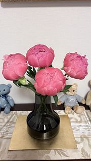 可愛い💕ヤッパ芍薬大好き💕この色は初めて購入したけどとても良かった!けど、部屋が暖かいから届いて箱開けたら既に3輪開き気味で花瓶に生けて1時間もしたら全開😅この調子だと何日持つかなぁ💦一輪だけ蕾で届いたからその子がユックリ花開いてくれたら良いなぁ